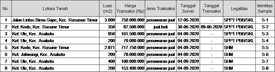 Keterangan Lurah di pinggiran kota Bima pada tahun 2020 dengan objek pembanding
