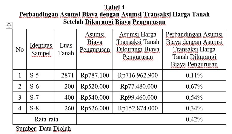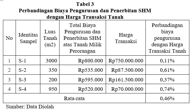 4 di atas, diketahui bahwa rata-rata rasio biaya pengurusan dan penerbitan SHM dengan harga transaksi tanah dengan