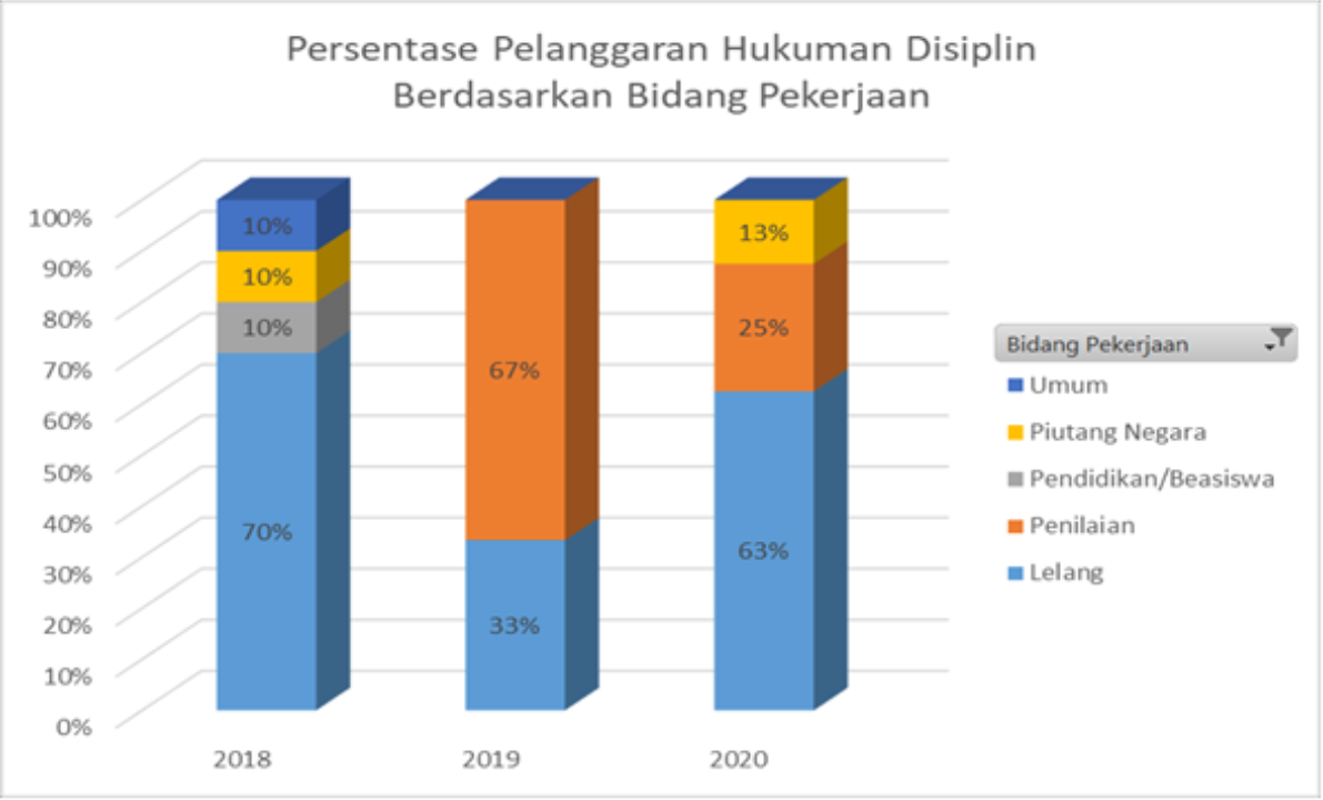 Mengutip dari lampiran dimaksud diketahui bahwa pada tahun 2018 dan 2020 bidang pekerjaan lelang memiliki porsi paling yang besar jika dibandingkan dengan bidang pekerjaan lainnya untuk kasus pelanggaran disiplin berupa penerimaan uang yang berkaitan dengan jabatan, yaitu 70% untuk tahun 2018 dan 63% untuk tahun 2020. Sedangkan secara total sepanjang tahun 2018 sampai dengan 2020, bidang pekerjaan lelang memiliki porsi sebesar 62% atau 13 (tiga belas) kasus dari total 21 (dua puluh satu) kasus. Hal ini menjadikan pekerjaan di bidang lelang menjadi bidang pekerjaan yang perlu mendapatkan perhatian khusus berkaitan dengan potensi terjadinya pelanggaran disiplin pegawai berupa penerimaan uang yang berkaitan dengan jabatan pegawai.