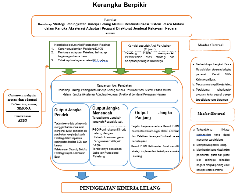 Oleh karena itu, Penulis merumuskan masalah dan membuat Kerangka Berpikir sebagai sebuah landasan teori dari rumusan masalah di atas untuk kemudian melakukan aksi perubahan dengan judul Peningkatan Kinerja Lelang Melalui Restrukturisasi Sistem Pasca Mutasi dan Adaptasi Pegawai Direktorat Jenderal Kekayaan Negara. Dalam rangka memberikan gambaran secara lebih komprehensif terkait aksi perubahan yang akan dilakukan, maka disajikan kerangka berpikir penyusunan Aksi Perubahan sebagaimana gambar berikut. (perhatikan ilustrasi di bawah ini)