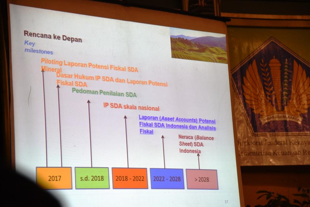 Lebih lanjut dikatakan Isti, berdasarkan rencana kerja yang telah disusun, pelaksanaan penyusunan neraca SDA direncanakan mulai tahun 2017 s.d 2028. Tahapan awal adalah piloting potensi SDA dilanjutkan berturut-turut pembuatan dasar hukum, penyusunan pedoman penilaian SDA, pelaksanaan IP SDA berskala nasional sampai dengan pelaporan berupa Laporan Potensi Fiskal SDA Indonesia berikut analisisnya.