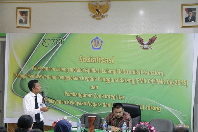 Perkenalan selaku nakhoda baru, Navis Zikra, Kepala KPKNL Sorong mengucapkan terima kasih atas kerja sama para satuan kerja sehingga tahun 2015 yang lalu KPKNL Sorong berhasil memperoleh penghargaan dari Menteri Keuangan sebagai Kantor Pelayananan Percontohan terbaik di lingkungan Kementerian Keuangan, menandai kata sambutan Kepala KPKNL Sorong. Selanjutnya Navis mengatakan bahwa untuk saat ini, KPKNL Sorong kembali ditunjuk menjadi peserta mewakili Kementerian Keuangan untuk menjadi peserta penilaian menjadi Kantor dengan prestasi sebagai kantor WBK/WBBM (Wilayah Bebas Korupsi/Wilayah Birokrasi Bersih dan Melayani), untuk itu Navis meminta masukan – masukan para peserta kegiatan agar perbaikan pelayanan dikemudian hari dapat dilaksankan secara optimal, baik itu dari segi pelayanaan lelang,maupun dari segi Pengelolaan kekayaan Negara.