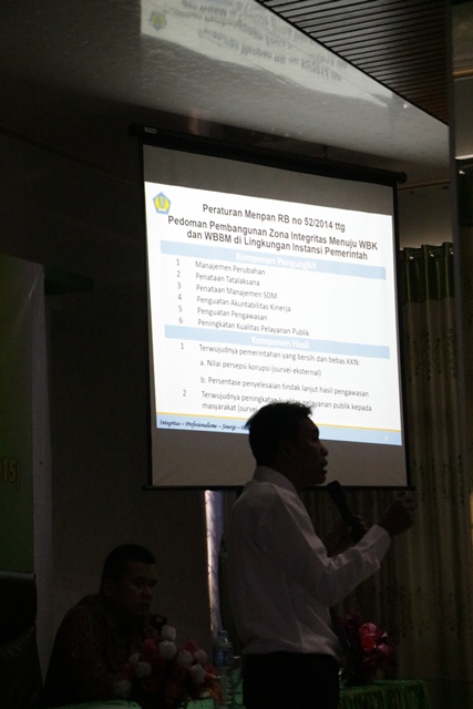 Pada sesi pertama, materi Sosialisasi Pembangunan Zona Integritas Menuju WBK dan WBBM di Lingkungan Instansi Pemerintah di bawakan oleh Antonius Susilo Eko Riadi selaku yang mewakili instansi Inspektorat Jenderal Kementerian Keuangan. Dalam pemaparannya Anton mengemukakkan bahwa ada dua komponen yang harus dinilai untuk menentukan suatu kantor apakah kantor tersebut sudah memenuhi syarat sebagai (Kantor Wilayah Bebas Korupsi Bebas Korupsi/Wilayah Birokrasi Bersih dan Melayani) atau tidak. Adapun kedua komponen dimaksud terdiri dari komponen pengungkit yaitu berupa Manajemen Perubahan, Penataan tatalaksana, penataan manajemen SDM, Penguatan Akuntabilitas Kinerja Penguatan pengawasan serta peningkatan Kualitas Pelayanan Publik sedankan komponen hasil terdiri atas terwujudnya pemerintahan yang bersih dan bebas KKN, hal ini bisa dilihat dari nilai persepsi korupsi dan persentase penyelesaian tindak lanjut hasil pengawasan adapun komponen hasil yang kedua yaitu terwujudnya peningkatan kualitas pelayanan publik kepada masyarakat (survey eksternal). Selanjutnya anton mengatakan bahwa komponen hasil sangat menentukan untuk perbaikan kinerja kantor yang akan datang, untuk itu pada kesempatan tersebut Anton berpesan kepada para stakeholder yang hadir pada kegiatan tersebut, agar dapat mengisi survey eksternal terhadap kinerja KPKNL Sorong.