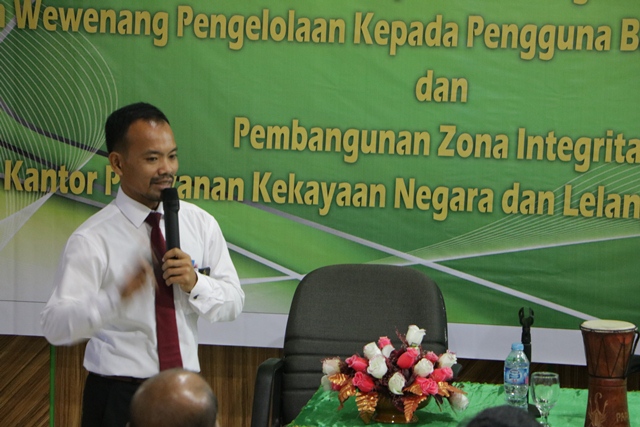 Selanjutnya Pada sesi Kedua, diselenggarakan sosialisasi Pelimpahan Wewenang Pengelolaan Kepada Pengguna Barang (PMK.04/PMK.06/2015), bertindak sebagai narasumber pada Sosialisasi tersebut adalah Didik Suryadi selaku staf Seksi Pengelolaan Kekayaan Negara KPKNL Sorong. Materi sosialisasi yang disampaikan oleh didik diantaranya yaitu Latar belakang dan dasar hukum adanya pelimapahan wewenang pengelolaan kepada pengguna barang, selanjutnya didik menyampaikan bahwa adapun ruang linkup dari pelimpahan wewenang yaitu Penggunaan berupa ; Penetapan status penggunaan,Pemindahtanganan berupa ; penjualan dan hibah, pemusnahan berupa ; persetujuan pemusnahan serta penghapusan berupa; persetujuan penghapusan sebagai akibat dari sebab-sebab lain. Dijelaskan pula bahwa yang bertindak sebagai pelaksana dari pengguna barang yang dilimpahi wewenang pengelolaan yaitu Menteri/Pimpinan Lembaga sedangkan pelaksana fungsional yaitu Sekretaris Jenderal/Sekretaris Kementerian/Sekretaris Utama, jaksa Agung Muda Pembinaan, Asisten Kepala POLRI Bidang Sarana dan Prasarana dan Pimpinan Kesekretariatan/Kepaniteraan dan yang perlu diperhatikan pengguna Barang tidak dapat meneruskan pelimpahan pendelegasian wewenang dan tanggung jawab dimaksud kepada Pengguna Barang.