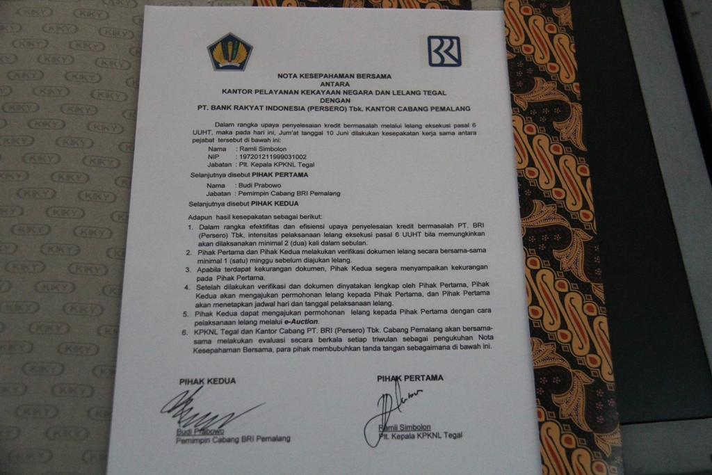 Tegal- Jumat, 10 Juni 2016, bertempat di ruang rapat PT Bank Rakyat Indonesia (BRI) Kantor Cabang Tegal, dilaksanakan penandatanganan nota kesepakatan kerja sama antara PT BRI Cabang sewilayah kerja Kantor Pelayanan Kekayaan Negara dan Lelang (KPKNL) Tegal.