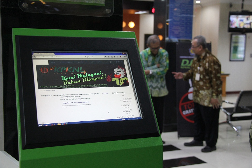Kegiatan penilaian selanjutnya adalah peninjauan ke Area Pelayanan Terpadu (APT). Pada sesi ini Win Handoyo didampingi kasubbag umum dan para kepala seksi dan menjelaskan mengenai sarana yang ada di APT, yaitu mesin antrian, Kios K, layanan front office, kotak saran / pengaduan, brosur, ruang konsultasi, ruang tunggu pelayanan, ruang KPKNL Surabaya Prioritas, loket pembayaran uang jaminan lelang, papan pengumuman serta layanan pengaduan.
