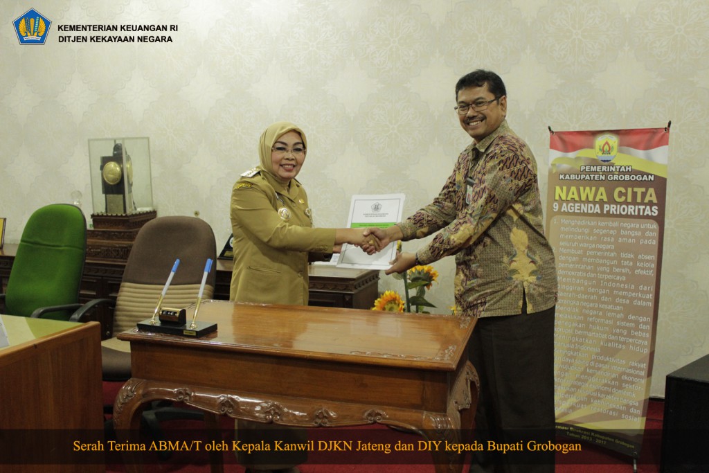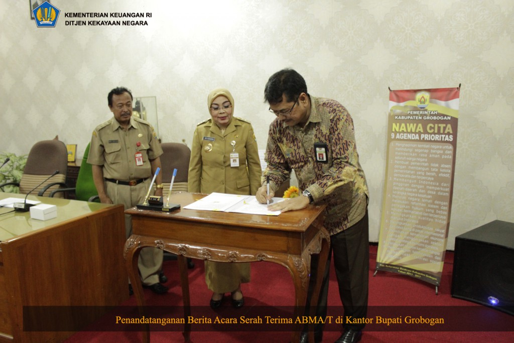 Pada tanggal 15 November 2016 dilakukan serah terima Aset Bekas Milik Asing/Tionghoa (ABMA/T) oleh Kanwil DJKN Jawa Tengah dan D.I Yogyakarta kepada Pemerintah Kabupaten Grobogan di ruang rapat Wakil Bupati Grobogan. Hadir secara langsung Kepala Kanwil DJKN Jawa Tengah dan D.I Yogyakarta Tavianto Noegroho didampingi Kepala Bidang Pengelolaan Kekayaan Negara (PKN) Sugeng Harijadi dan Kepala Seksi PKN I Harist Syafiuddin dalam acara penandatanganan Berita Acara Serah Terima tersebut.