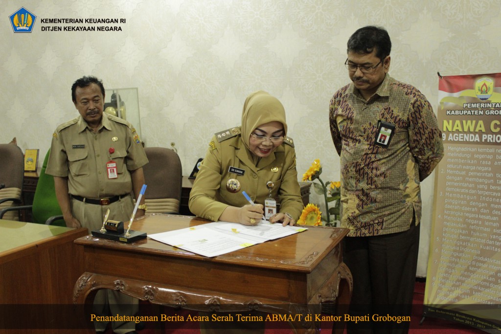Serah terima ABMA/T diterima langsung oleh Bupati Grobogan Sri Sumarni yang didampingi oleh Asisten Administrasi Sekretariat Daerah Kabupaten Grobogan Nur Sahid. Selain itu, acara dihadiri pula perwakilan dari Kantor Pertanahan dan seluruh SKPD Kabupaten Grobogan.
