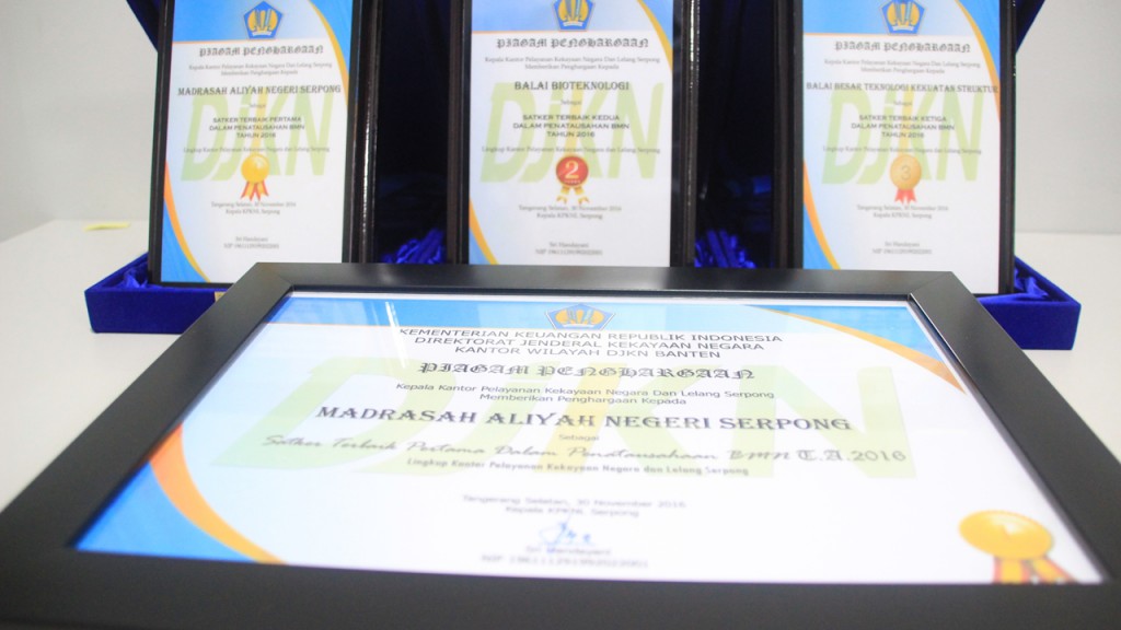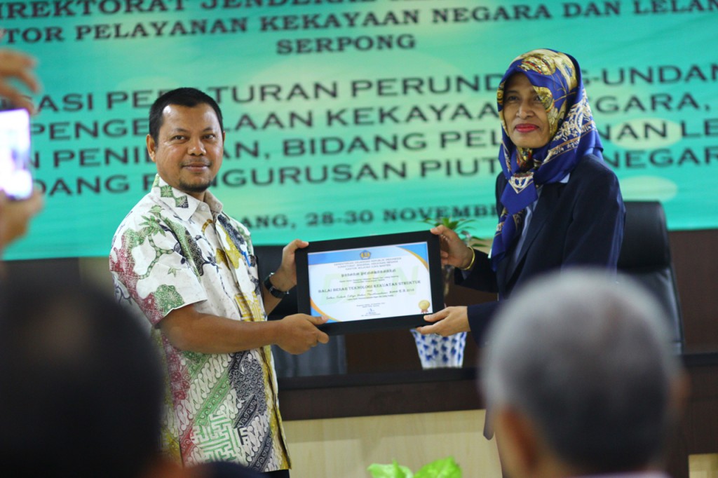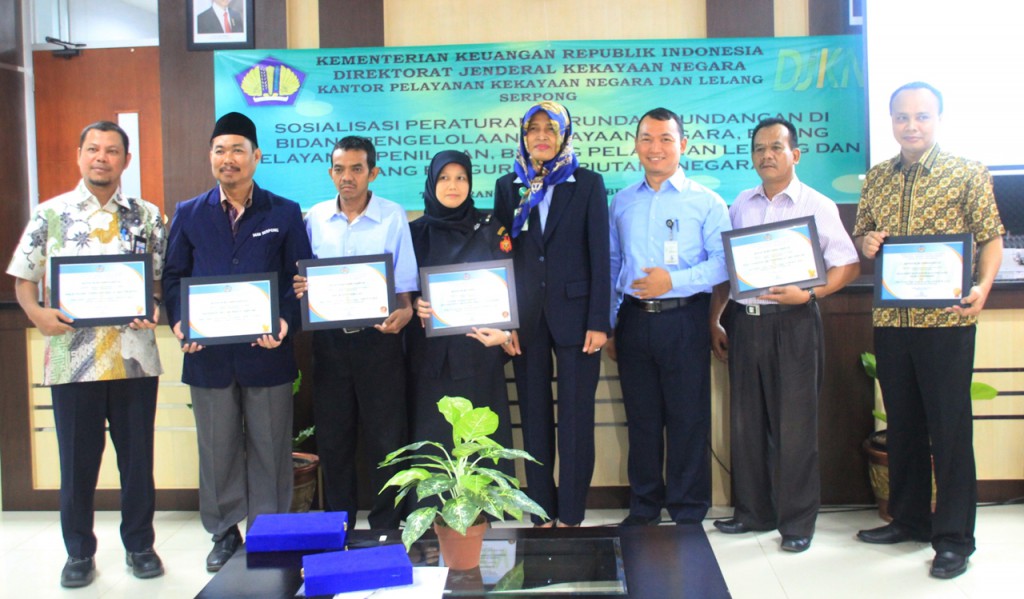 Di akhir acara, KPKNL Serpong memberikan apresiasi terhadap kinerja pengelolaan BMN Tahun 2016 kepada satuan kerja terbaik, yang terbagi dalam dua kategori, yaitu kategori Penatausahaan BMN Tahun 2016 dan Pengelolaan BMN Tahun 2016. (HI-KPKNL Serpong).