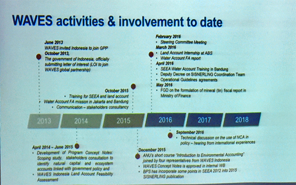 Sementara itu perwakilan dari World Bank Diji Chandrasekharan Behr mempresentasikan mengenai WAVES (Wealth Accounting and Valuation of Ecosystem Services). WAVES adalah sebuah kemitraan global yang bertujuan untuk mempromosikan pembangunan berkelanjutan dengan memastikan bahwa sumber daya alam diikutsertakan dalam perencanaan pembangunan dan neraca ekonomi nasional.
