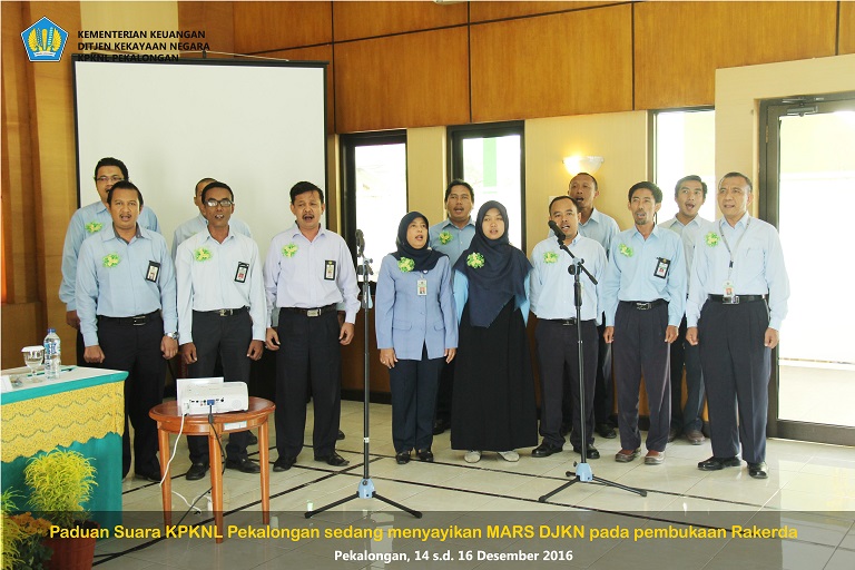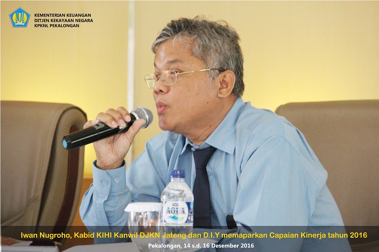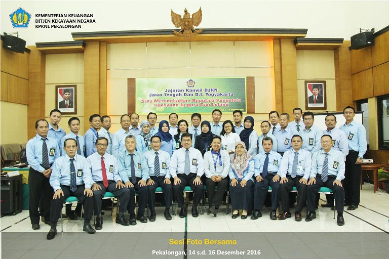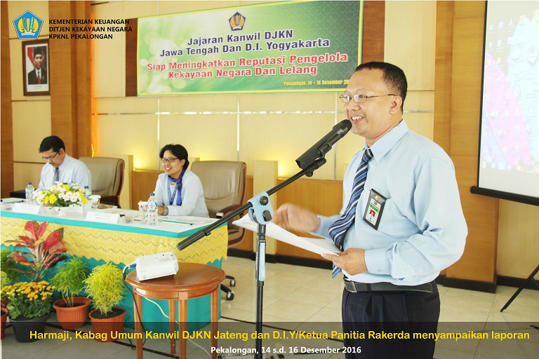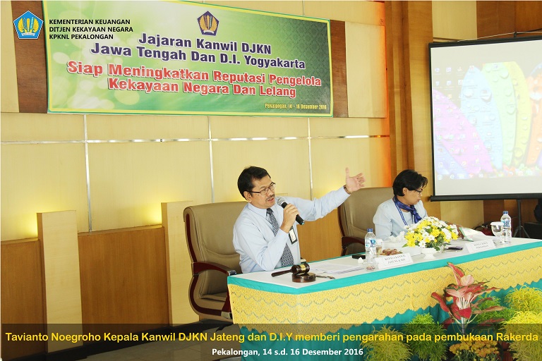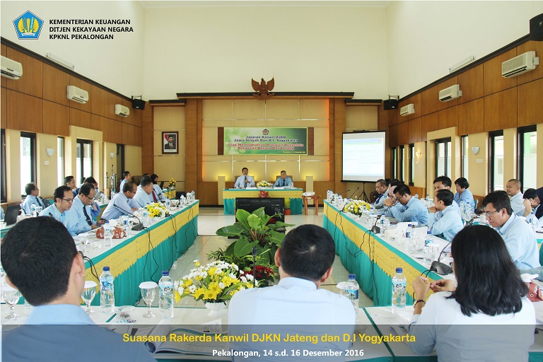 Pekalongan – Kantor Wilayah Direktorat Jenderal Kekayaan Negara (Kanwil DJKN) Jawa Tengah dan D.I.Yogyakarta menyelenggarakan Rapat Kerja Daerah (Rakerda) pada tanggal 14 sampai dengan 16 Desember 2016 bertempat di Kantor Pelayanan Kekayaan Negara dan Lelang (KPKNL) Pekalongan. Rakerda dihadiri oleh 44 orang yang terdiri 14 orang dari Kanwil DJKN Jawa Tengah dan D.I.Yogyakarta dan 30 orang dari KPKNL di lingkungan Kanwil DJKN Jawa Tengah dan D.I.Yogyakarta.