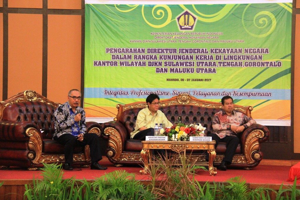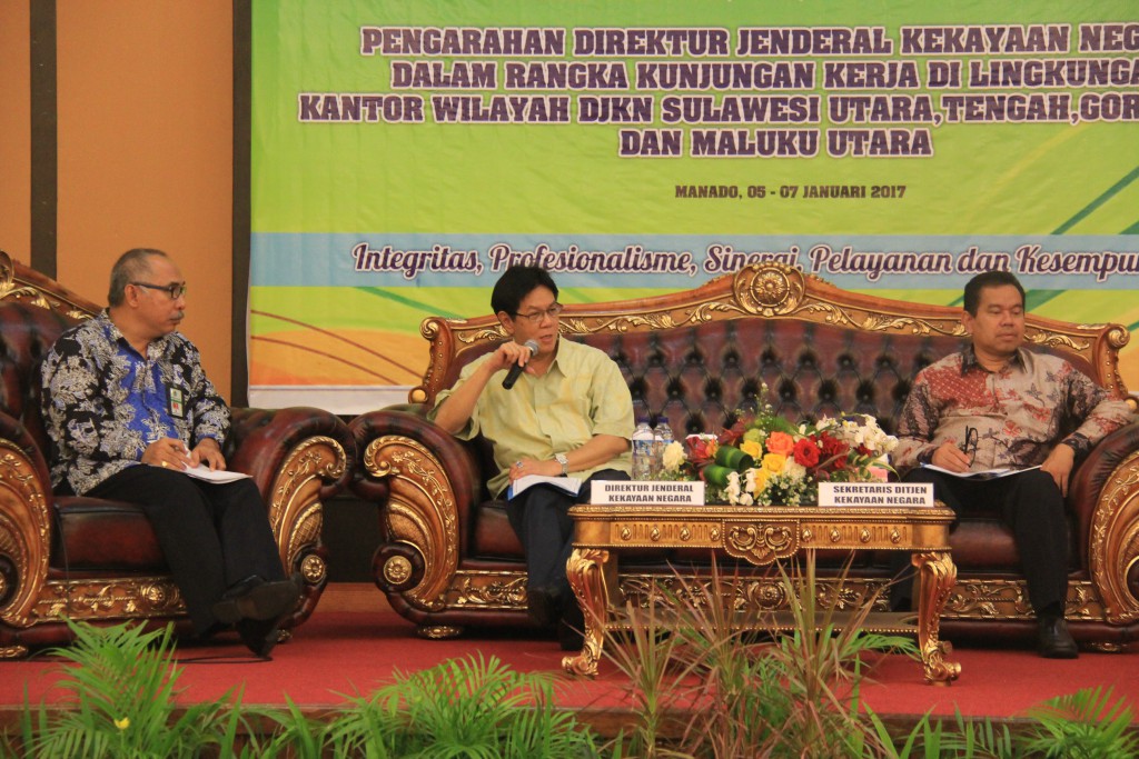 Sebelumnya Kepala Kanwil DJKN Suluttenggomalut Ferdinan Lengkong melaporkan kinerja jajarannya. "Penilaian yang dilakukan Kanwil dan KPKNL (Kantor Pelayanan Kekayaan Negara dan Lelang-red) terhadap aset daerah membuat laporan Keuangan beberapa daerah mendapat opini WTP (Wajar Tanpa Pengecualian-red) dari BPK (Badan Penerimaan Keuangan-red)," tuturnya.