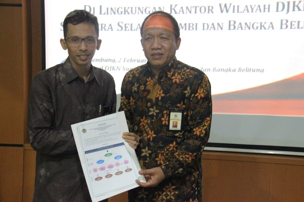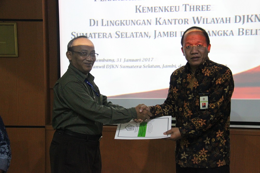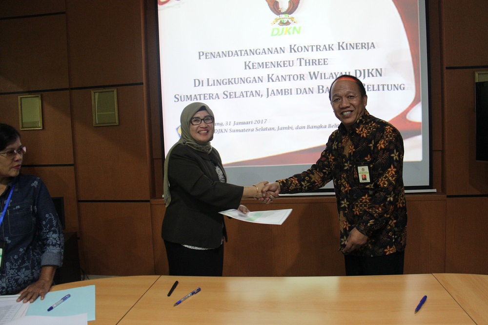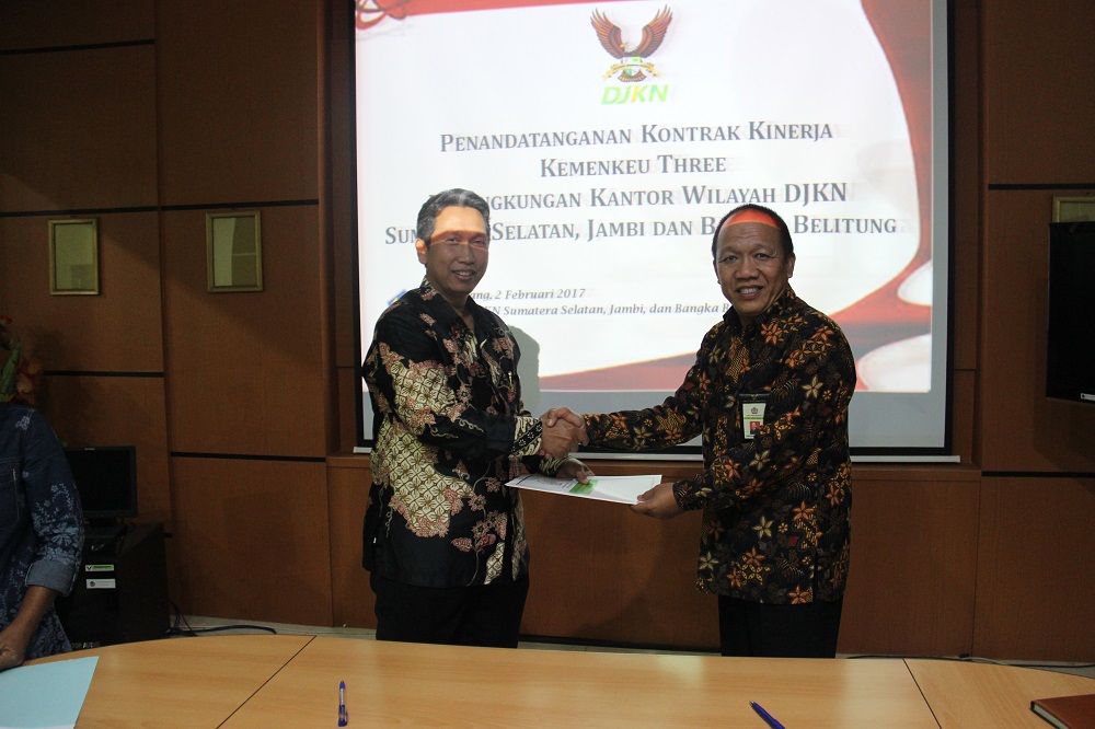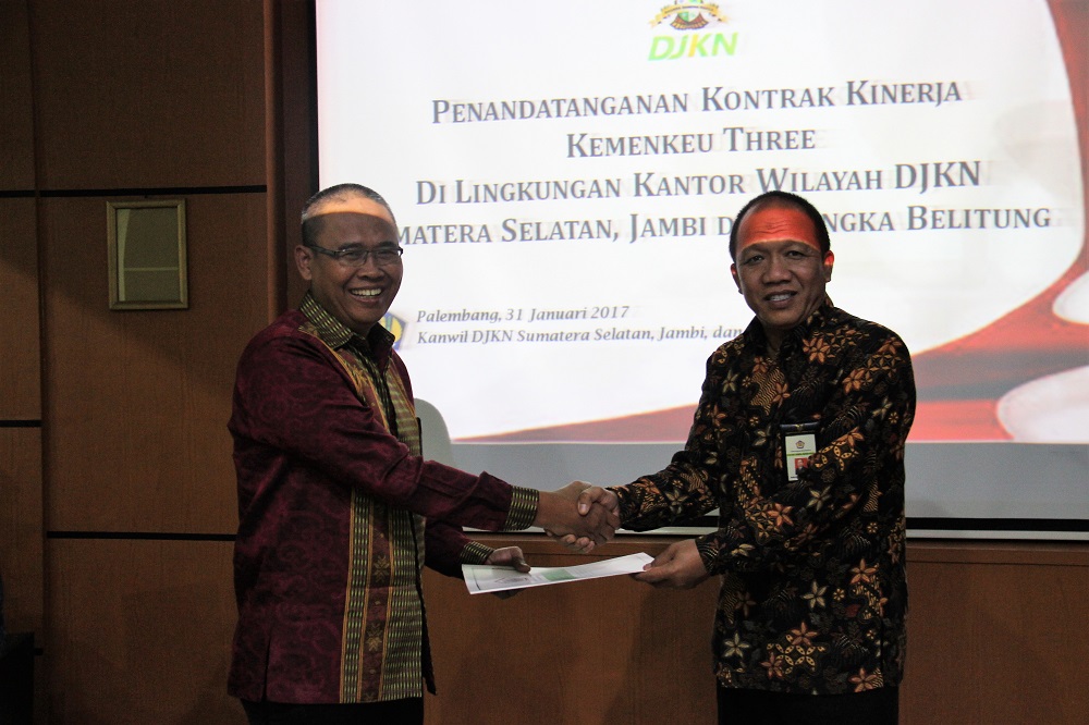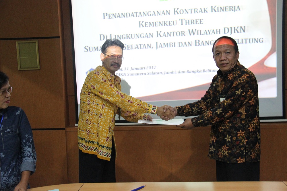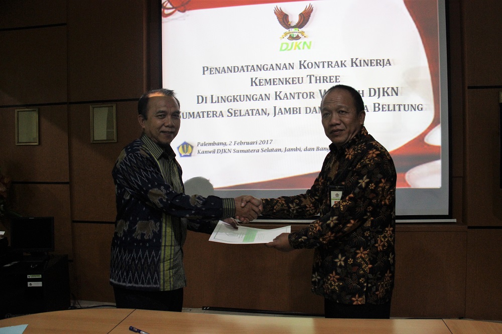 Palembang – Indikator Kinerja Utama (IKU) yang bagus adalah IKU yang menantang. Jika ada target IKU tidak tercapai, harus dapat dijelaskan dan dipertangungjawabkan. Demikian disampaikan Kepala Kanwil DJKN Sumatera Selatan, Jambi, dan Bangka Belitung (SJB) Anugrah Komara pada saat memberikan arahan sebelum penandatangan Kontrak Kinerja Kemenkeu-Three Tahun 2017 di ruang rapat utama Kanwil DJKN SJB, Kamis (2/2).