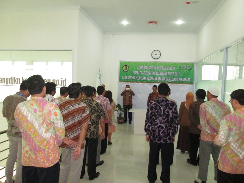 Pekanbaru – Disaksikan langsung oleh Kepala Kantor Pelayanan Kekayaan Negara dan Lelang (KPKNL) Pekanbaru Wahyu purnomo, pada Selasa (7/2) seluruh kepala seksi dan pegawai KPKNL Pekanbaru melaksanakan kewajibannya menandatangani kontrak kinerja tahun 2017.