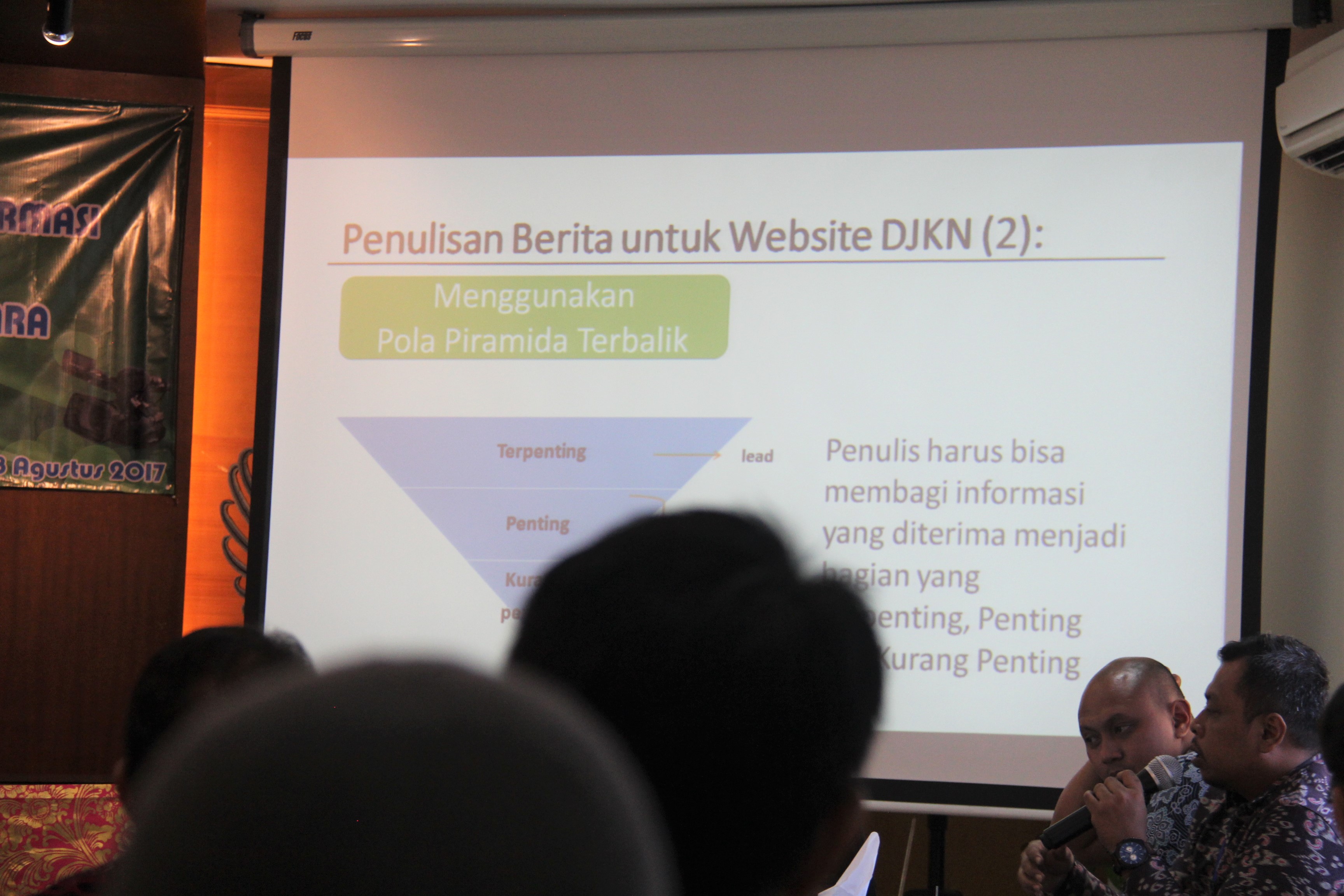 Dimulai dengan sifat-sifat dalam bahasa jurnalistik ia menjabarkan satu persatu hal yang wajib dipenuhi ketika seseorang menulis berita. “Bahasa Jurnalistik memiliki tiga sifat yaitu Accurate, Breaf dan Clear. Accurate berarti tidak ada toleransi untuk kesalahan dalam penulisan, sedangkan breaf mengandung arti bahwa berita itu harus ringkas, tidak menggunakan kalimat yang redudance (berlebihan). Sedangkan Clear berarti tidak multi tafsir dan harus jelas,” ujar pria yang pernah bertugas di Denpasar ini. “Penulisan bahasa pada surat resmi berbeda dengan penulisan berita di media,” lanjutnya. Pekerjaan keseharian pada DJKN yang erat kaitannya dengan istilah-istilah hukum memerlukan kemampuan penulis mengolah kata untuk disampaikan menjadi bahasa jurnalistik yang mudah dipahami dan tidak bias.