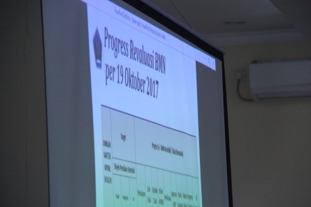Selanjutnya, Kepala KPKNL Bogor, Abdul Manaf menyampaikan pemaparan singkat terkait profil KPKNL Bogor, progres report, dan hambatan/kendala pelaksanaan Revaluasi Barang Milik Negara (BMN) serta capaian kinerja KPKNL Bogor. Lebih lanjut, Manaf melaporkan bahwa pada Triwulan III Tahun 2017 seluruh Indikator Kinerja Utama pada KPKNL Bogor telah hijau dengan Nilai Kinerja Organisasi (NKO) KPKNL Bogor mencapai 117,56%.