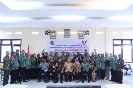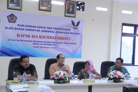 Bogor - Direktur Jenderal Kekayaan Negara, Isa Rachmatarwata melakukan kunjungan kerja ke Kantor Pelayanan Kekayaan Negara dan Lelang (KPKNL) Bogor, Jumat (20/10/2017). Kunjungan kali pertama ini dilakukan dalam rangka memberikan arahan dan berdiskusi dengan seluruh pegawai KPKNL Bogor. Kegiatan tersebut juga dihadiri Sekretaris Direktorat Jenderal Kekayaan Negara (DJKN), Dodi Iskandar, Kepala Kanwil DJKN Jawa Barat, Nuning Sri Rejeki Wulandari dan Kepala Bagian Umum DJKN.