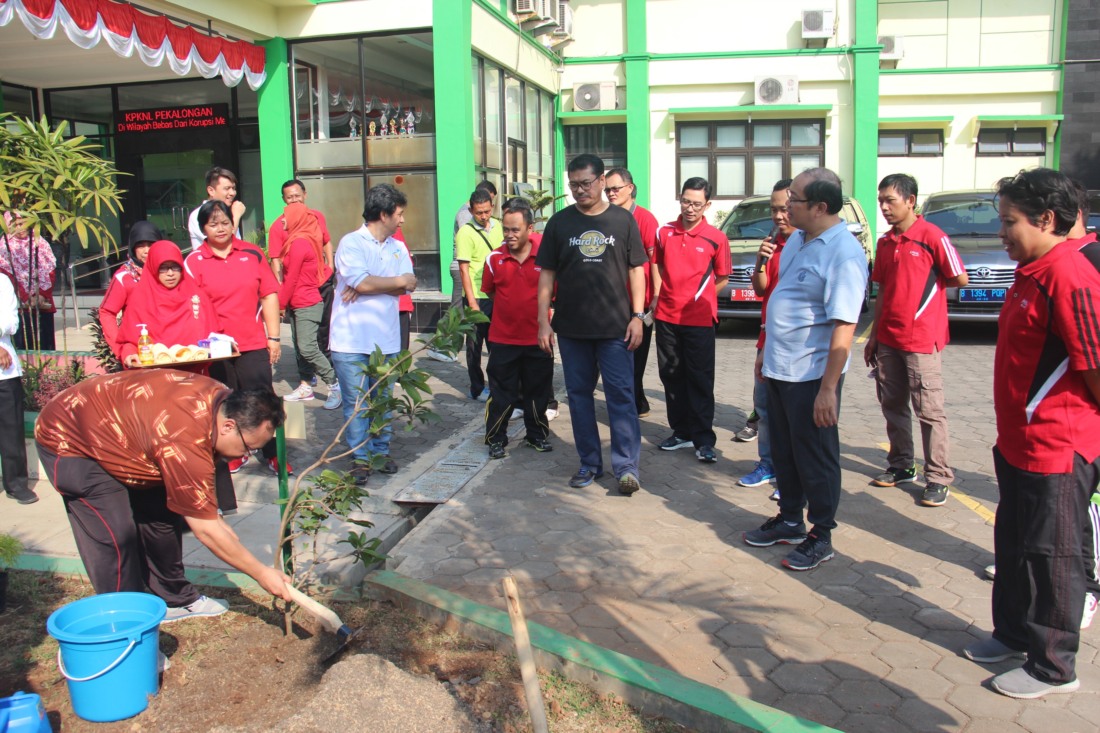 Agenda berikutnya yakni senam pagi dan penanaman pohon di halaman depan KPKNL Pekalongan serta peninjauan gedung kantor. Hal tersebut merupakan wujud kepeduliannya beserta para pejabat terhadap KPKNL Pekalongan. Menanam pohon dimaknai dengan menanam doa, harapan dan semangat bekerja sehingga harus dipelihara agar tetap hidup dan tumbuh dengan baik.