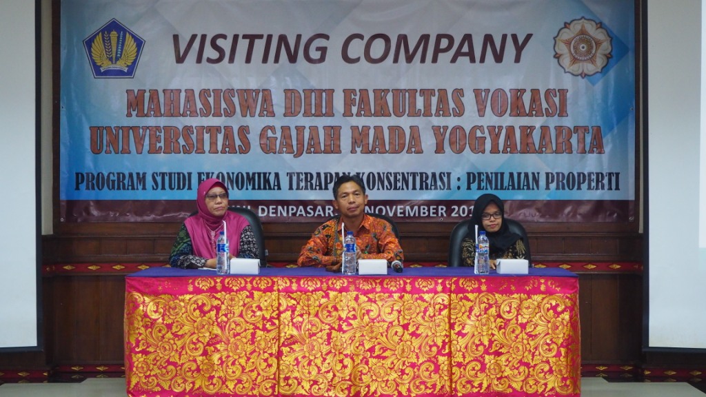 Sambutan dilanjutkan oleh Dra. Wahyu Hidayati, dosen Fakultas Vokasi Universitas Gajah Mada. Ia berterima kasih kepada KPKNL Denpasar karena telah menerima kedatangan mahasiswa UGM dengan sangat memuaskan. Kedatangan pihak UGM ini merupakan serangkaian tujuan untuk menimba ilmu, berbagi pengetahuan dan belajar lebih mengenal penilaian khususnya di KPKNL. Lulusan DIII Penilaian nantinya masih memiliki harapan menjadi penilai baik penilai publik maupun penilai pemerintah. Wahyu Hidayati mengatakan sudah ada 22 peserta seleksi CPNS Kementerian Keuangan khususnya DJKN yang berasal dari program studi penilaian properti. Ia berharap nantinya 10 orang yang terpilih adalah perwakilan dari anak didiknya. Saat ini, Fakultas Vokasi telah bekerjasama dengan pihak MAPPI dan berencana untuk membentuk program studi baru yaitu D-IV agar nantinya lebih mudah dalam mendapatkan pekerjaan.