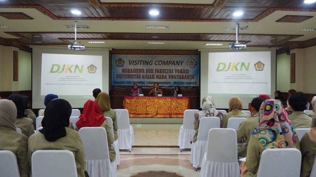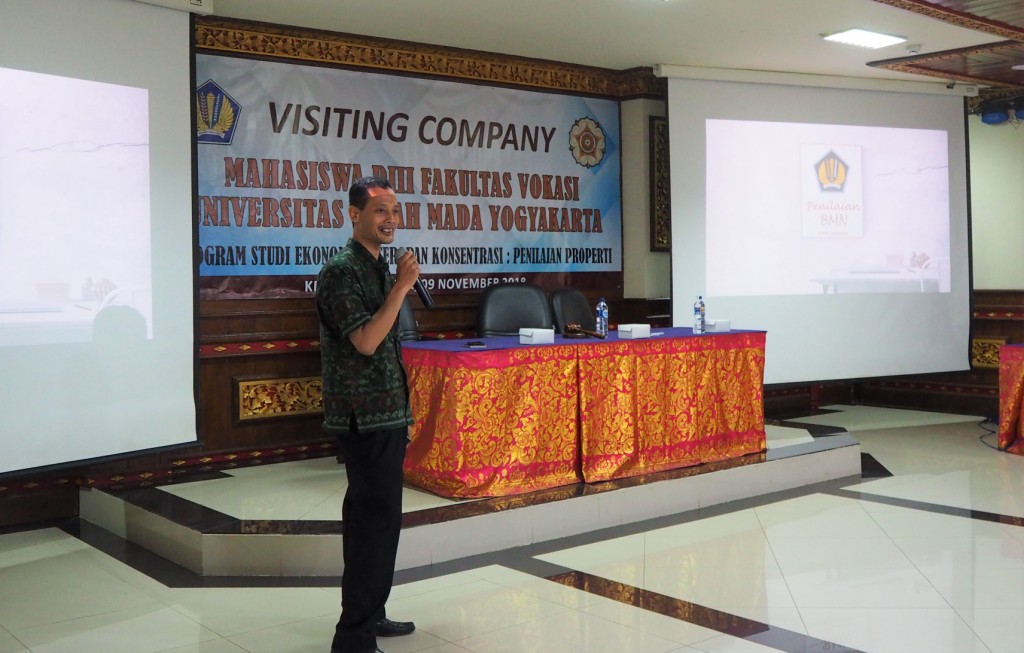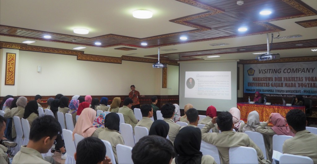 Denpasar (9/11) – Jumat, 9 November 2018, KPKNL Denpasar kedatangan tamu jauh yakni Mahasiswa DIII Fakultas Vokasi Universitas Gajah Mada Yogyakarta Program Studi Ekonomika Terapan Konsentrasi: Penilaian Properti. Acara dengan nama Visiting Company ini dihadiri oleh 53 mahasiswa dengan 2 pendamping serta perwakilan dari MAPPI Kota Denpasar. Selepas ibadah Sholat Jumat, kegiatan yang berlangsung di Aula Kanwil DJKN Bali dan Nusa Tenggara, dibuka dengan sambutan dari Kepala Kantor KPKNL Denpasar, Wahyu Nendro. Wahyu mengatakan ia senang dengan kedatangan pihak UGM dalam berbagi ilmu mengenai Peran, Peluang, dan Tantangan bagi Penilai. Pada kesempatan kali ini, materi yang disampaikan Wahyu adalah peran KPKNL sebagai unit pelayanan yang mengurusi pengelolaan kekayaan negara. Ia juga menjelaskan posisi penilai dalam rangkaian proses pengelolaan kekayaan negara. Wahyu berharap para mahasiswa dapat menyerap ilmu yang diberikan dengan senang hati dan dipahami bersama-sama. Ia juga berharap dengan menambah ilmu yang didapatkan, nantinya para mahasiswa dapat mengisi kekosongan kebutuhan industri khususnya sebagai penilai.
