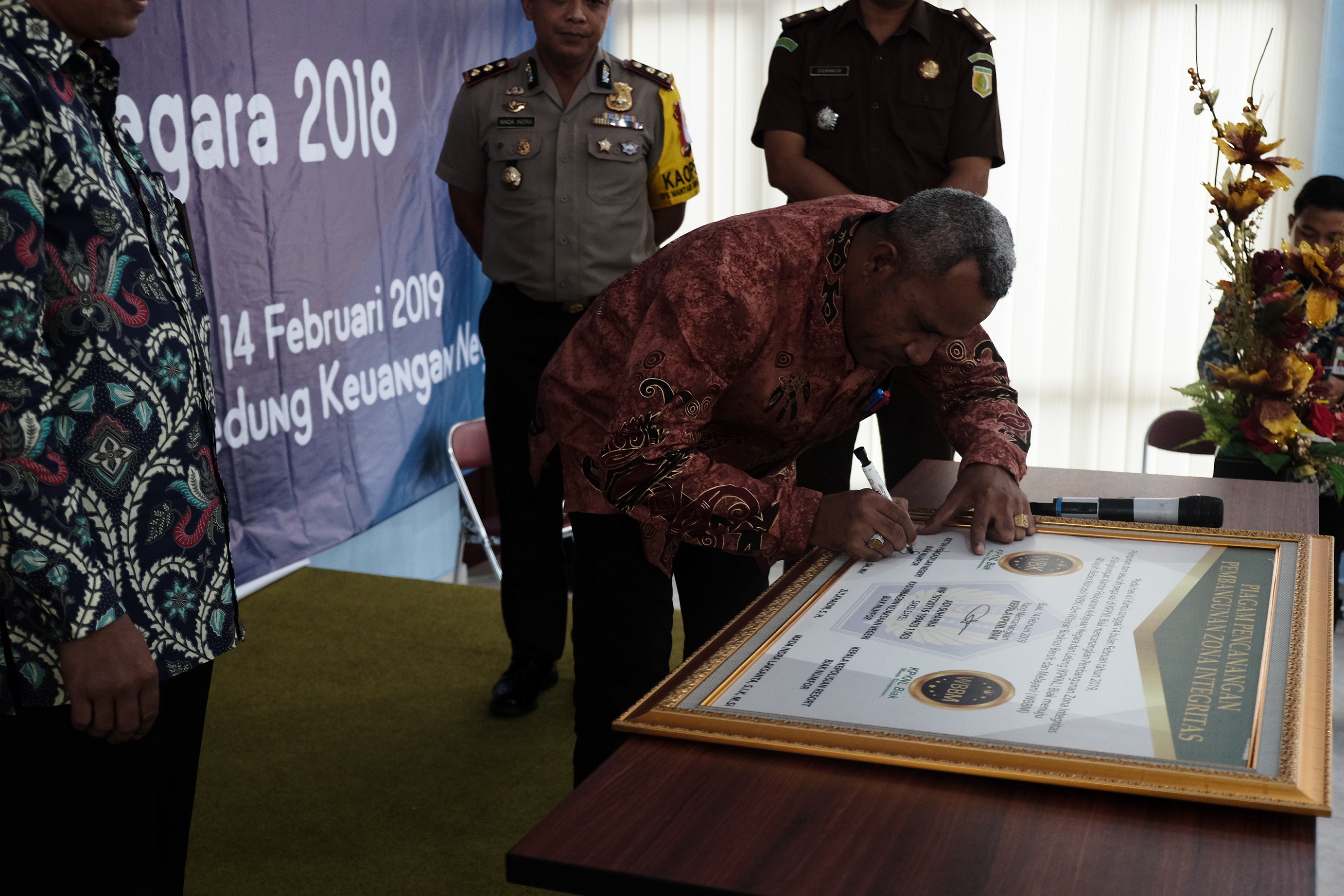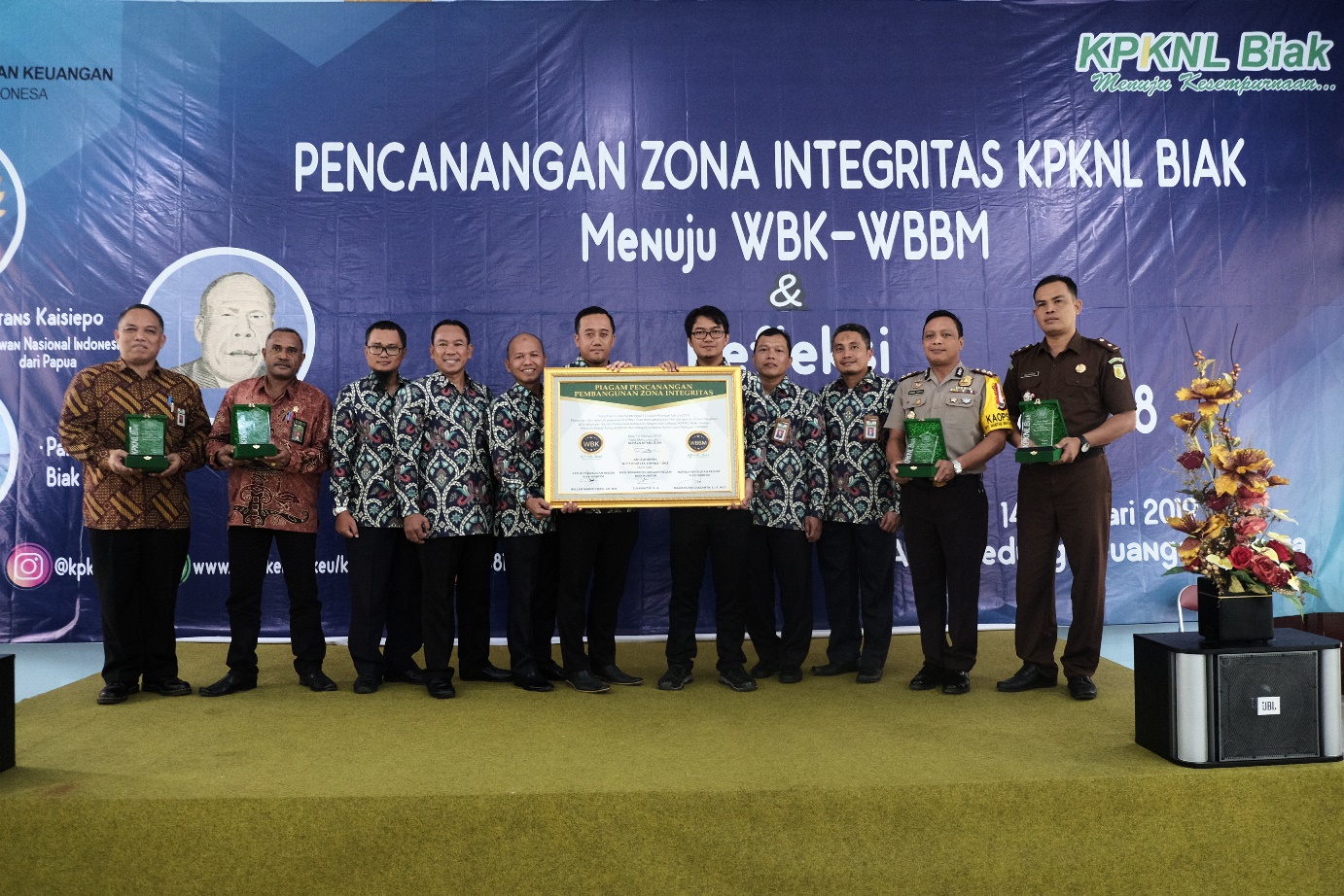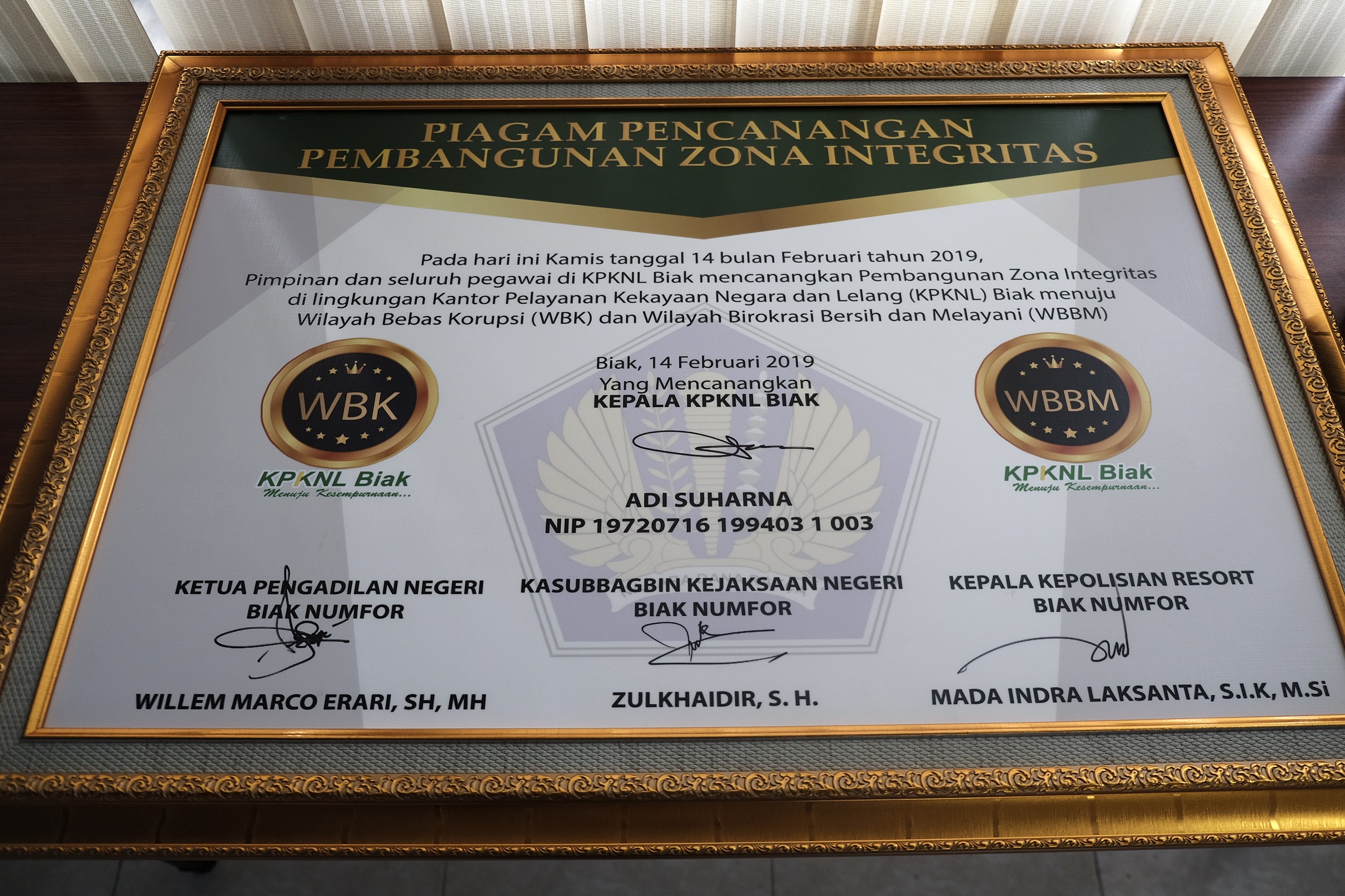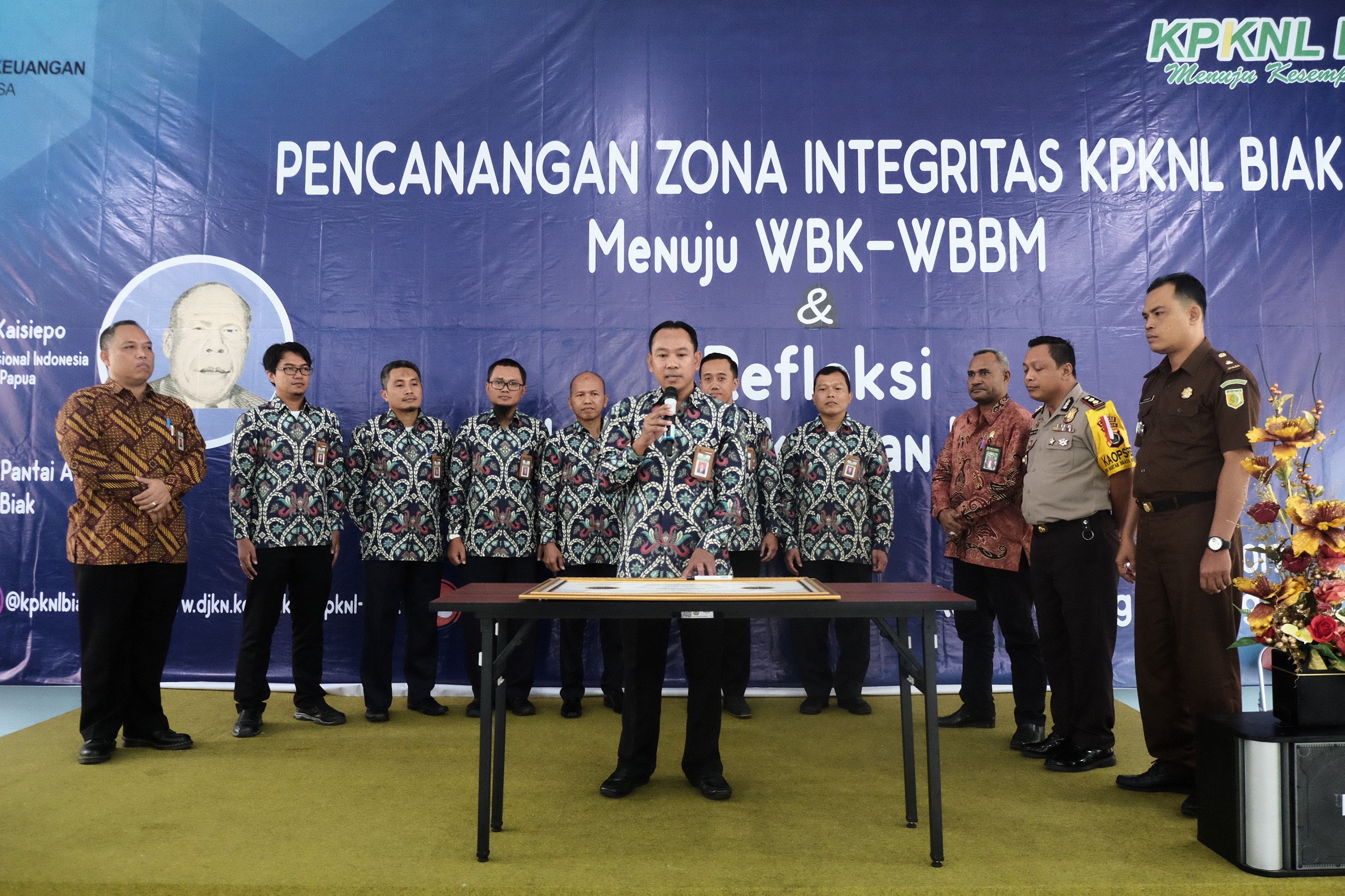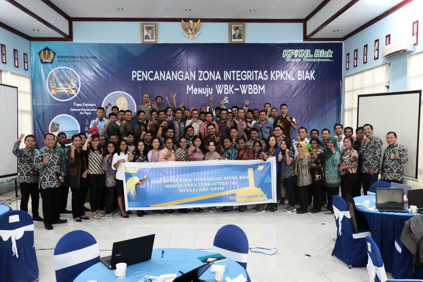 Biak – Kantor Pelayanan Kekayaan Negara dan Lelang (KPKNL) Biak terus berupaya meningkatkan layanan yang berorientasi pada kepuasan stakeholder. Hal ini salah satunya diwujudkan dengan penandatanganan Pencanangan Pembangunan Zona Integritas (ZI) di hadapan perwakilan stakeholder pada Kamis (14/2). Sebanyak 24 pimpinan instansi dan 97 operator SIMAK BMN menjadi saksi langkah awal KPKNL Biak menuju Wilayah Bebas Korupsi Wilayah Birokrasi Bersih dan Melayani (WBK-WBBM).