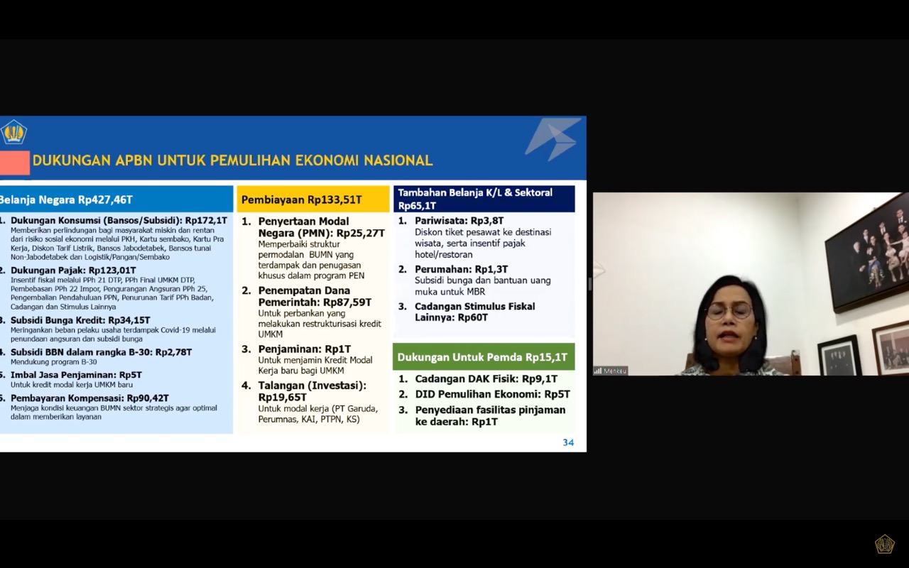 Selain itu, untuk mendukung dunia usaha, Menkeu mengatakan bahwa UMKM akan mendapatkan subsidi bunga, penundaan pembayaran cicilan pokok dan mendapatkan insentif pajak dalam bentuk pajak yang ditanggung pemerintah sehingga UMKM tidak perlu membayar pajak penghasilan. “Prinsipnya, intervensi pada dunia usaha ini ditujukan agar usaha-usaha tersebut mampu bertahan dan menjaga agar mereka dapat memanfaatkan keadaan ekonomi yang bertahap mengalami pemulihan,” ungkap Menkeu.