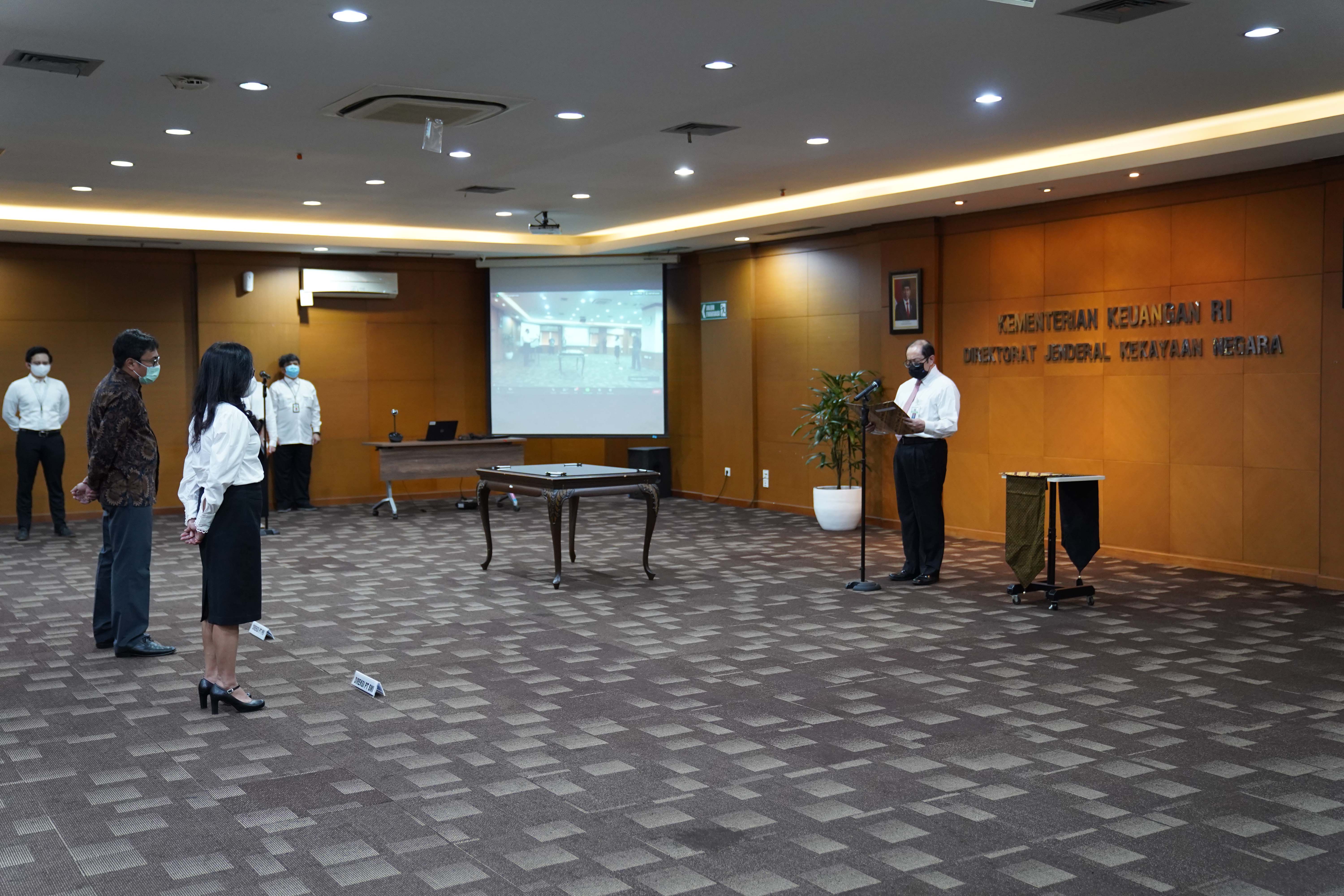 Jakarta- Kondisi perekonomian nasional dan global saat ini mewajibkan kita semua untuk mengerahkan upaya terbaik dalam mengantisipasi dampak dari pandemi Corona Virus Disease (COVID-19). Badan Usaha Milik Negara (BUMN) di bawah Kementerian Keuangan (Kemenkeu) memiliki peranan penting karena mengemban mandat khusus untuk membantu pemerintah mengatasi berbagai tantangan yang dihadapi. “Tidak hanya berorientasi terhadap keuntungan atau profit oriented, namun juga ditujukan sebagai fiscal tools atau instrumen yang dapat digunakan sewaktu-waktu oleh pemerintah dalam menggerakkan dan menjaga perekonomian nasional,” ujar Direktur Jenderal Kekayaan Negara (Dirjen KN) Isa Rachmatarwata pada saat melantik Andre Permana sebagai anggota Direksi PT Penjaminan Infrastruktur Indonesia (PT PII) dan Sylvi Juniarty Gani sebagai anggota Direksi PT Sarana Multi Infrastruktur (PT SMI) pada Senin, (22/06) di Aula Kantor Pusat DJKN.
