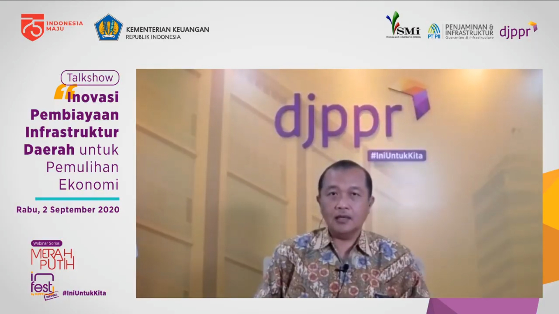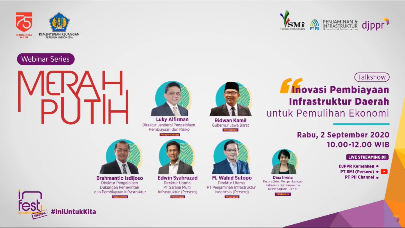 Jakarta – Dalam melaksanakan program Pemulihan Ekonomi Nasional (PEN) untuk meminimalkan dampak Covid-19 terhadap perekonomian Indonesia, pemerintah memberikan perhatian khusus terhadap pembangunan infrastruktur daerah untuk menjadi jumpstart pemulihan ekonomi. “Salah satu satu pengungkit yang paling efektif memberikan efek multiplier adalah pembangunan infrastruktur,” ujar Direktur Jenderal Pembiayaan dan Pengelolaan Risiko Kementerian Keuangan Luky Alfirman saat mengawali acara webinar bertajuk Inovasi Pembiayaan Infrastruktur Daerah untuk Pemulihan Ekonomi yang diselenggarakan Rabu (2/9) melalui aplikasi daring zoom.us.