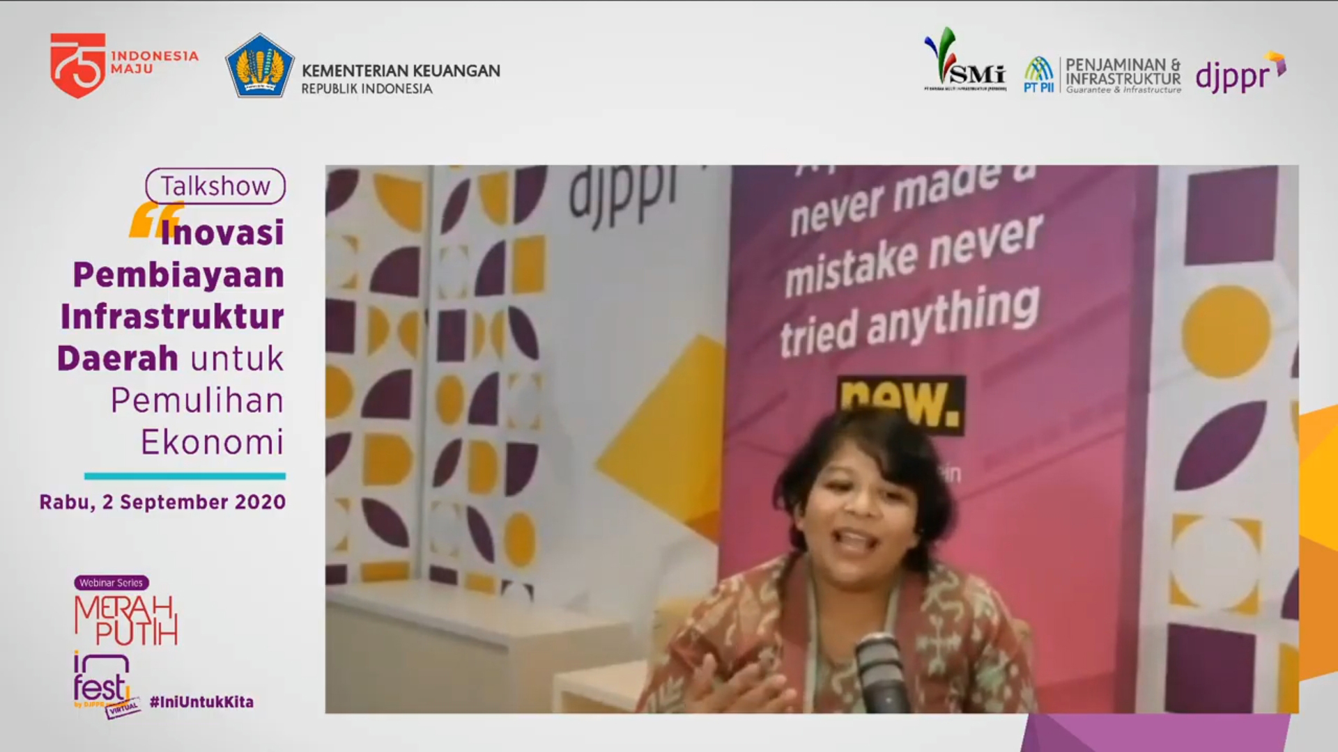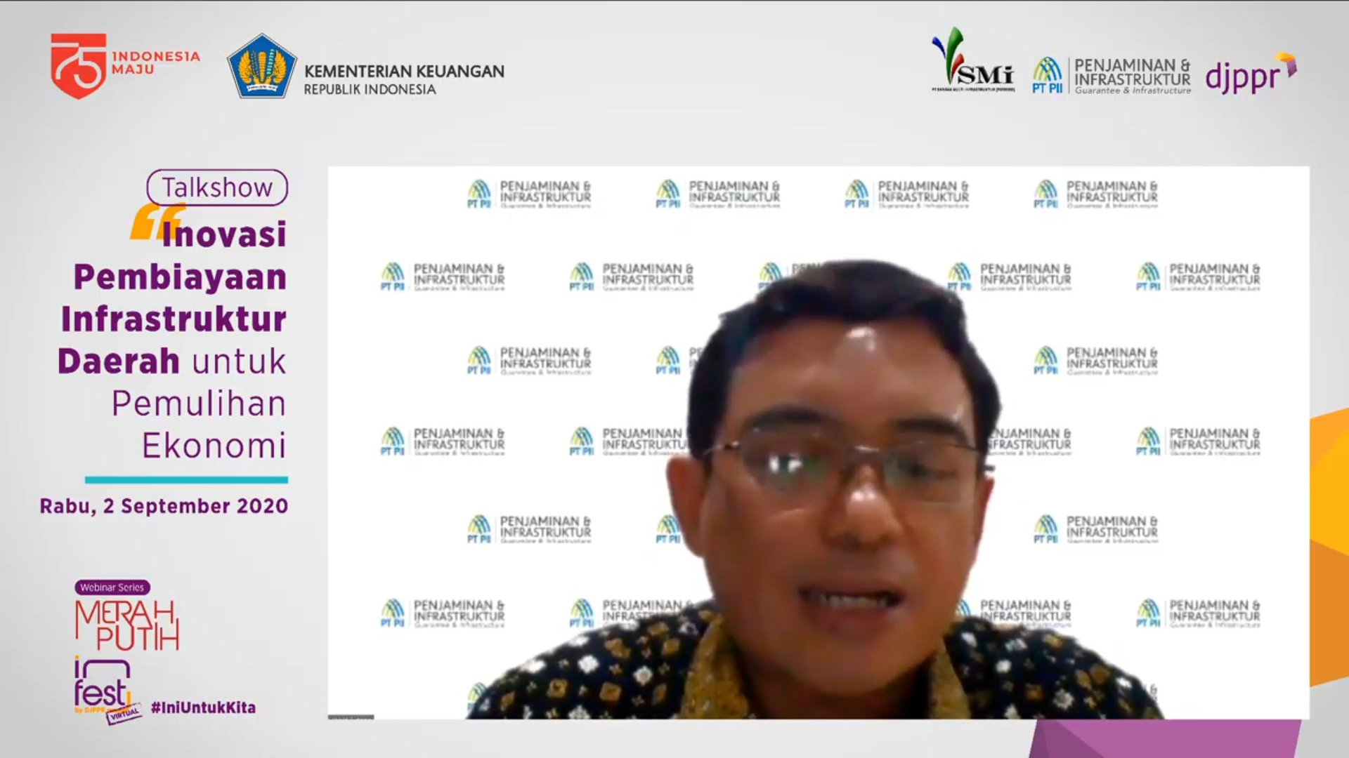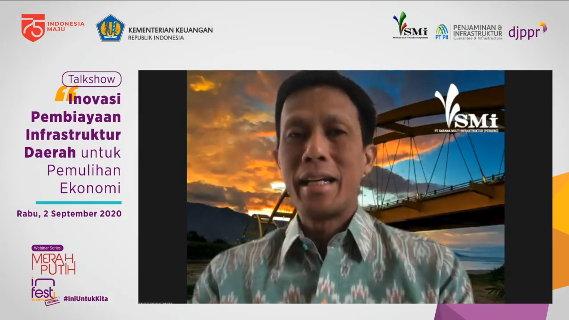 Ia menegaskan kembali salah satu peran PT SMI adalah menyalurkan pinjaman untuk pemulihan ekonomi kepada daerah dan pinjaman dukungan program PEN. Ia memaparkan mengenai pinjaman PEN daerah bersumber dari Dana APBN sebesar Rp10 triliun, sementara pinjaman dukungan program PEN bersumber dari dana korporasi PT SMI sebesar Rp5 triliun.