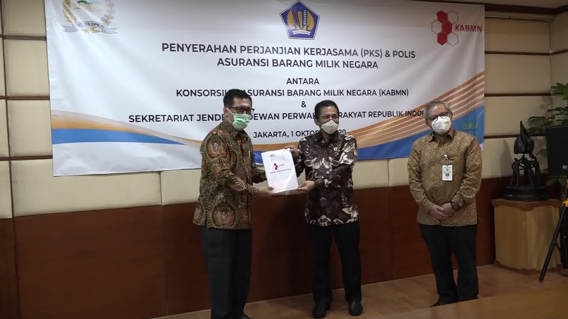 Jakarta - Direktur Barang Milik Negara (BMN) Direktorat Jenderal Kekayaan Negara (DJKN) Encep Sudarwan bersama dengan Ketua Konsorsium Asuransi BMN Didit Mehta Pariadi menyerahkan Perjanjian Kerjasama dan Polis Asuransi BMN kepada Sekretaris Jenderal Dewan Perwakilan Rakyat Republik Indonesia (DPR RI) Indra Iskandar pada Kamis (1/10) di Gedung Nusantara DPR RI. Dalam sambutannya, Encep menjelaskan bahwa Perjanjian Kerjasama dan Polis Asuransi BMN tersebut bertujuan untuk mengamankan aset negara agar keberlangsungan pelayanan umum dan kelancaran tugas dan fungsi pemerintahan selalu terjaga. “Asuransi BMN adalah bentuk pengamanan fisik terhadap aset negara,” ujarnya.