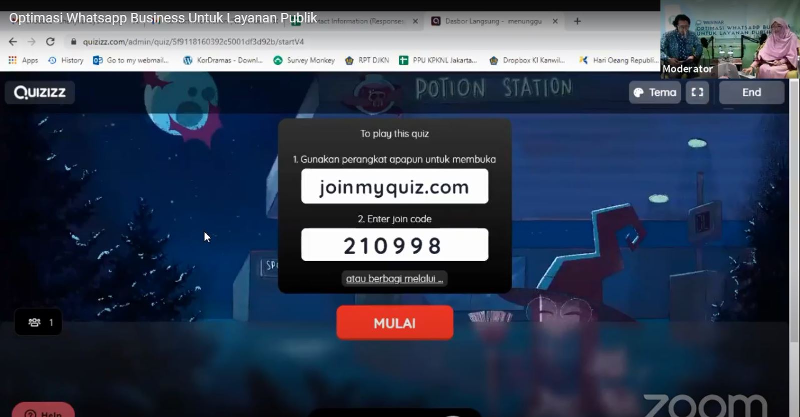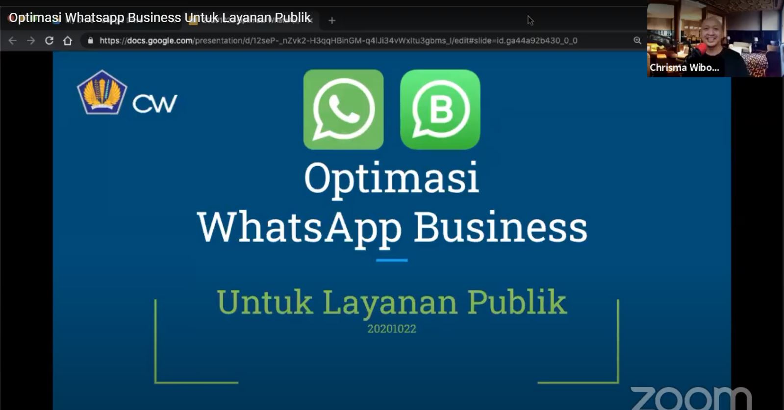 Lebih lanjut, Chrisma menjelaskan mengenai penggunaan aplikasi WhatsApp dan WhatsApp Business. Berdasarkan data yang ia kumpulkan, Chrisma menyebutkan bahwa WhatsApp menjadi salah satu media sosial paling aktif digunakan oleh masyarakat Indonesia dengan penetrasi mencapai 83%. Ia juga menjelaskan tips penggunaan WhatsApp Business, yang dapat digunakan untuk memberikan informasi mengenai layanan publik. “Karena sifat WhatsApp yang luas jangkauannya maka pemberian informasi tidak hanya sepihak tapi dapat dilakukan dengan interaksi dua pihak dengan pengguna jasa,” terang Chrisma. (HI Kanwil DKI)