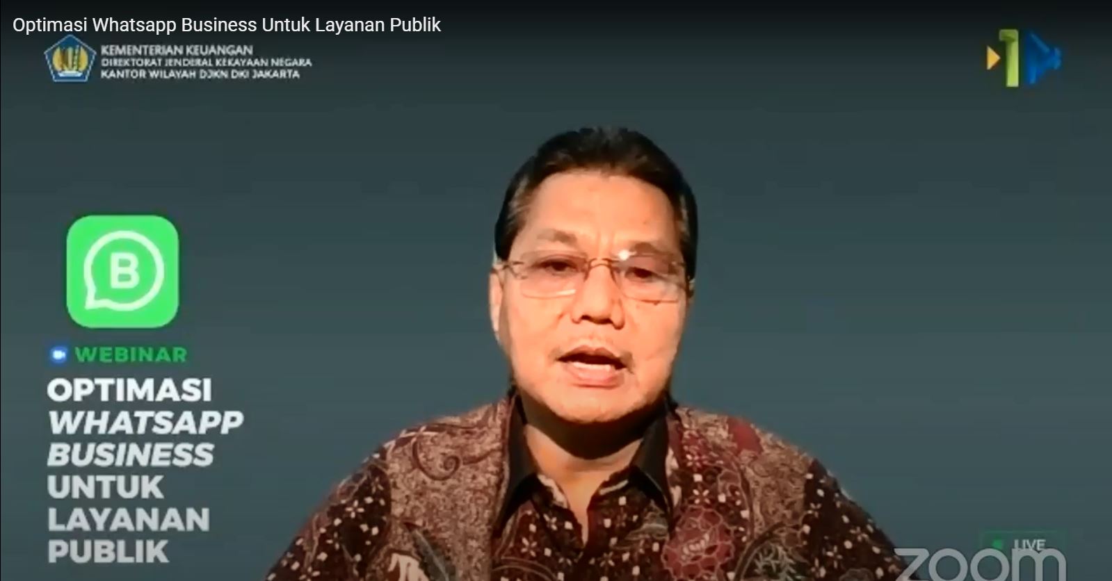 Jakarta - Kementerian Keuangan mulai mengintegrasikan inisiatif transformasi ke dalam konteks yang lebih modern dengan menerapkan aspek digitalisasi. Direktorat Jenderal Kekayaan Negara (DJKN) sebagai salah satu eselon satu pada Kemenkeu sudah melakukan transformasi tersebut dengan cara melakukan digitalisasi pelayanan. “Ini merupakan implementasi ke-15 Inisiatif Strategis Program Reformasi Birokrasi dan Transformasi Kelembagaan di lingkungan Kementerian Keuangan Tahun 2020 – 2024,” jelas Kepala Kantor Wilayah (Kanwil) DJKN Daerah Khusus Ibu Kota (DKI) Jakarta Hady Purnomo dalam web seminar (webinar) “Optimasi WhatsApp Business Untuk Layanan Publik” yang diadakan pada Kamis (22/10) secara daring melalui aplikasi zoom.