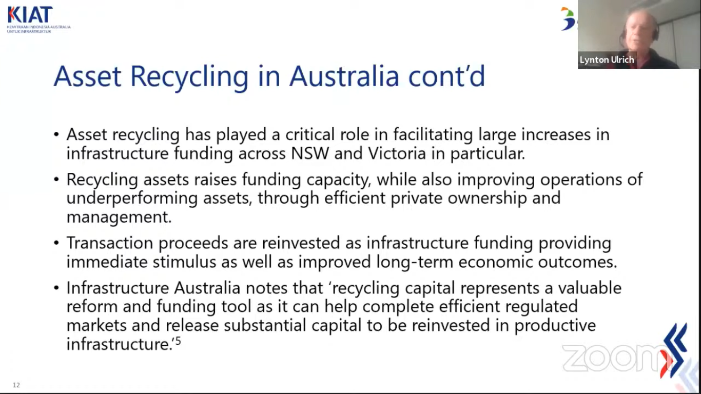 Hal ini disetujui oleh Lynton Ulrich, PPP Probity Adviser pada Kemitraan Indonesia Australia untuk Infrastruktur (KIAT). Menurutnya, asset recycling telah memainkan peran penting dalam memfasilitasi peningkatan besar dalam pendanaan infrastruktur di New South Wales dan Victoria. “Mendaur ulang aset meningkatkan kapasitas pendanaan, sekaligus meningkatkan operasi aset yang berkinerja buruk, melalui kepemilikan dan manajemen swasta yang efisien,” katanya.