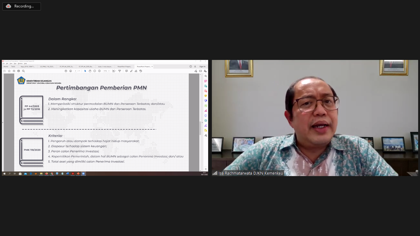 "Kita juga ingin melihat BUMN partisipasi dalam bangkitkan perekonomian, lapangan kerja tercipta, kegiatan usaha diteruskan yang punya multiplier effect. PMN jadi salah satu cara juga untuk pemulihan ekonomi nasional ini," kata Direktur Jenderal Kekayaan Negara Isa Rachmatarwata dalam kegiatan media briefing yang dilakukan secara daring, Jumat (6/11).