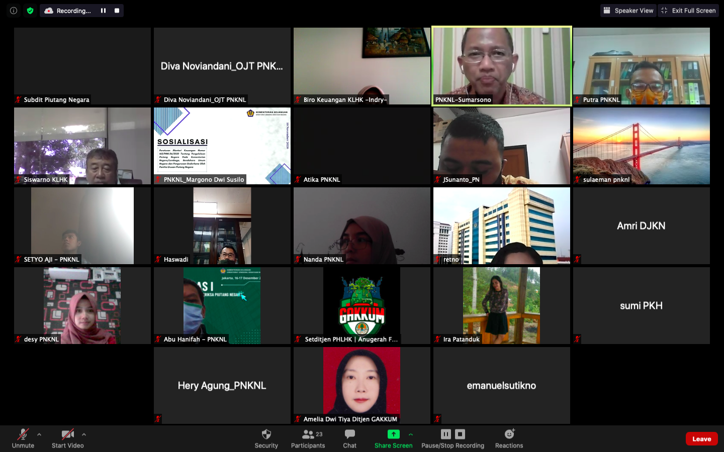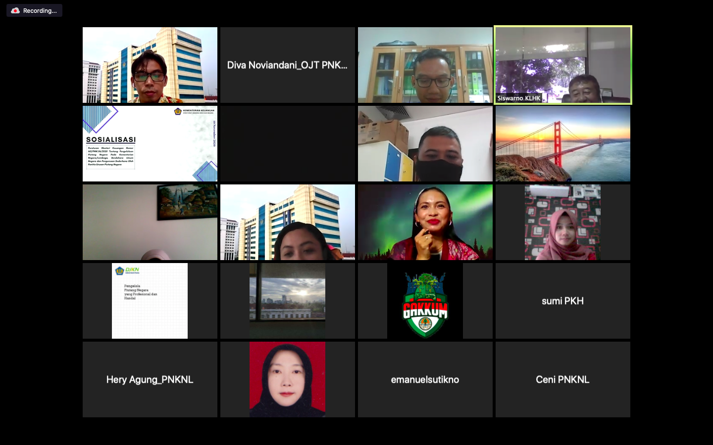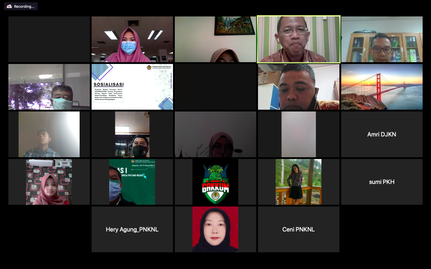 Jakarta – Direktorat Piutang Negara dan Kekayaan Negara Lain-lain (PNKNL) Direktorat Jenderal Kekayaan Negara (DJKN) menyelenggarakan rapat daring dengan Kementerian Lingkungan Hidup dan Kehutanan (KLHK) mengenai pengelolaan Piutang Negara pada Selasa (19/01). Tak hanya membahas pengelolaan dan sistem pelaporan Piutang Negara pada KLHK, rapat ini juga membincangkan tantangan, persiapan rekonsiliasi data, serta penyesuaian pokok-pokok aturan pada Peraturan Menteri Keuangan Nomor 163/PMK.06/2020 (PMK 163/2020) tentang Pengelolaan Piutang Negara pada Kementerian/Lembaga (K/L), Bendahara Umum Negara (BUN) dan Pengurusan Sederhana oleh Panitia Urusan Piutang Negara (PUPN).