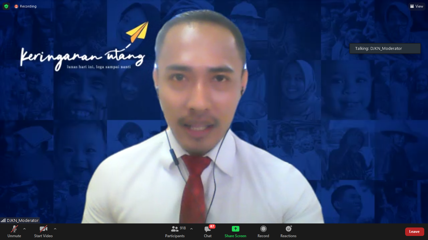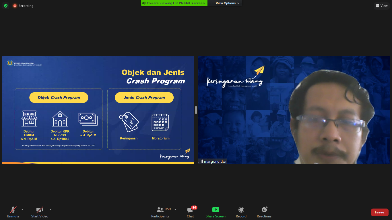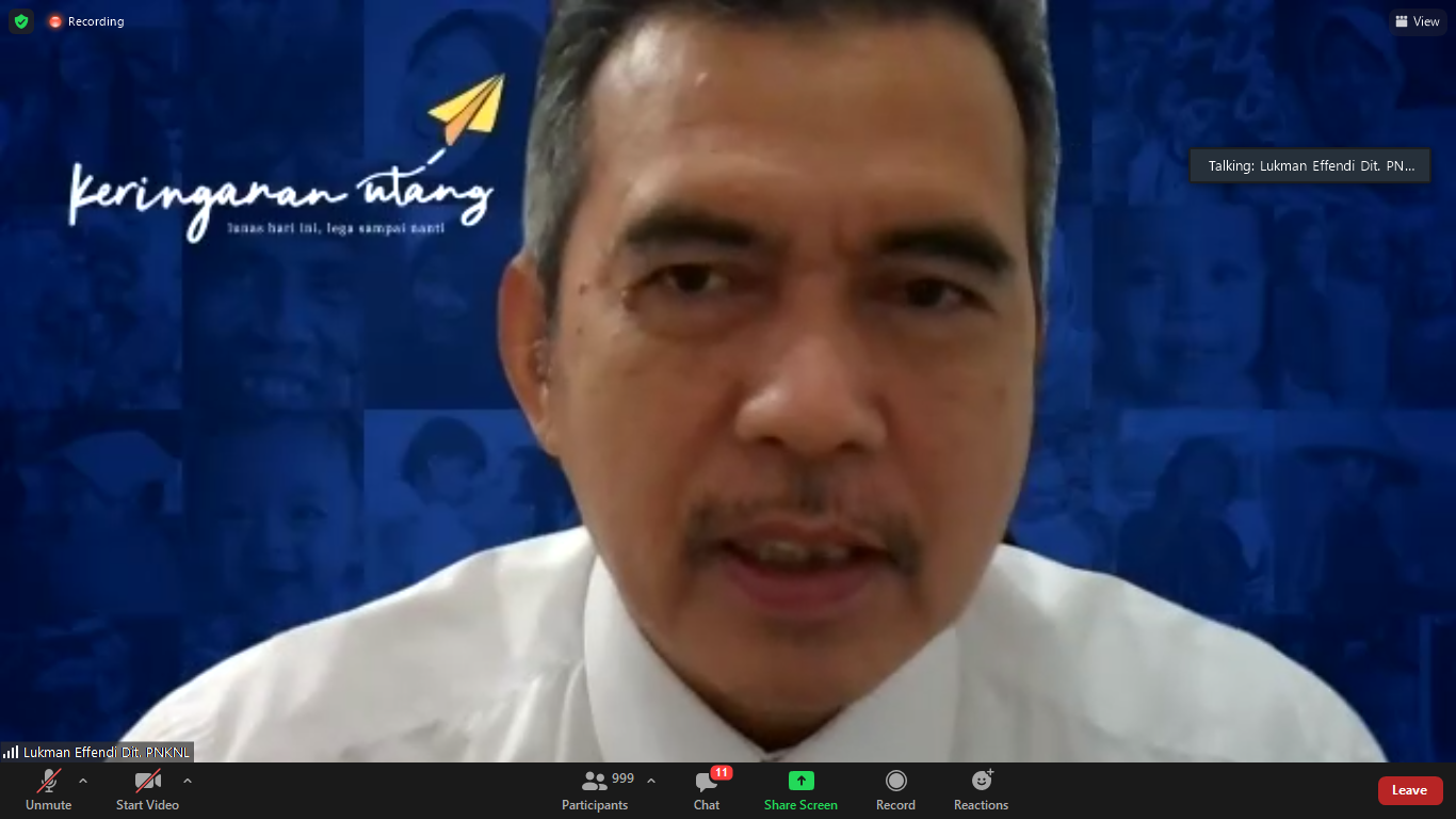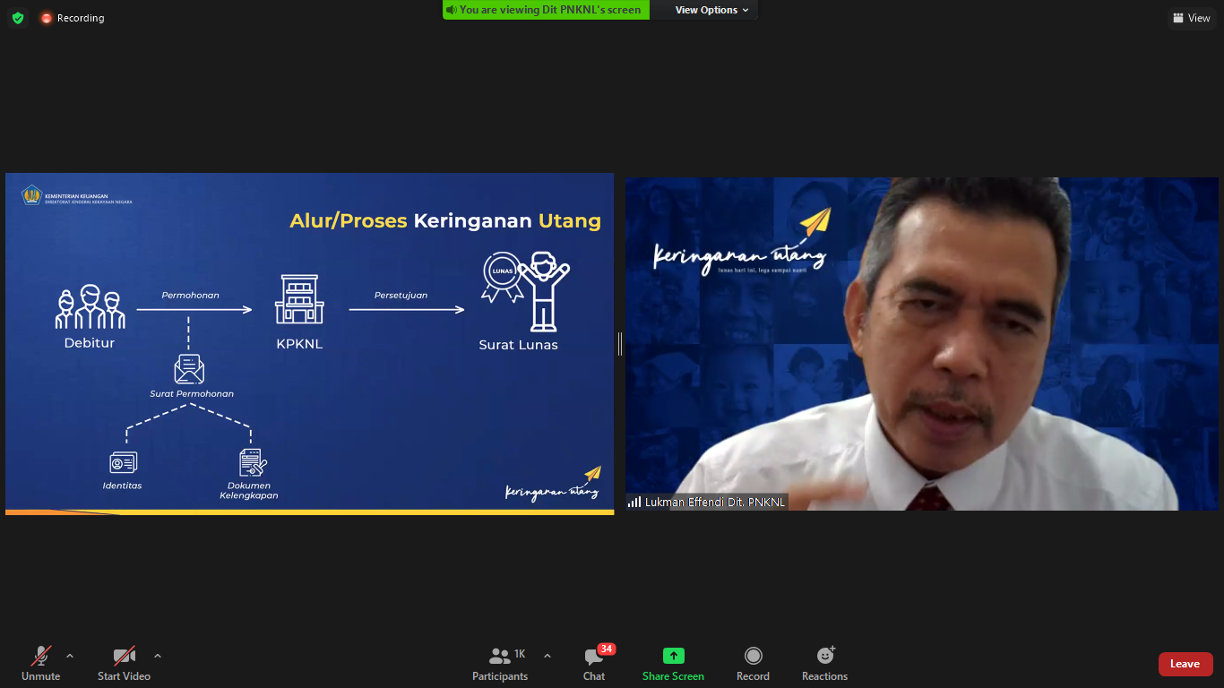Jakarta - Direktorat Jenderal Kekayaan Negara (DJKN) memberikan sosialisasi daring terkait Program Keringanan Utang kepada para perwakilan kementerian/lembaga (K/L), rumah sakit pemerintah, dan univesitas negeri yang menjadi penyerah piutang negara, Senin (15/3). Menurut Direktur Jenderal Kekayaan Negara Rionald Silaban, pihaknya menyadari bahwa setiap klasifikasi debitur membutuhkan penanganan khusus dalam hal pendekatan maupun penelusuran posisi dan alamat debitur.