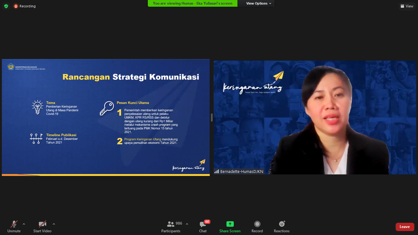 Untuk mendukung penyampaian Program Keringanan Utang ke masyarakat, DJKN juga telah merancang serangkaian strategi komunikasi yang dapat dijadikan acuan oleh para penyerah piutang. “Pesan kunci strategi komunikasi ini sederhana, kita ingin membantu, lho,” kata Kepala Subdirektorat Hubungan Masyarakat Bernadette Yuliasari Mulyatno. Dari pesan kunci tersebut, ia memaparkan metode-metode yang ditempuh oleh DJKN dan KPKNL untuk dapat efektif memberitahu dan mendorong debitur agar bersedia mengikuti Program Keringanan Utang. “Kami berharap K/L juga dapat menggemakan apa yang dilakukan oleh KPKNL. Mungkin bisa dilakukan joint program komunikasi, di media sosial atau media briefing,” usulnya.
