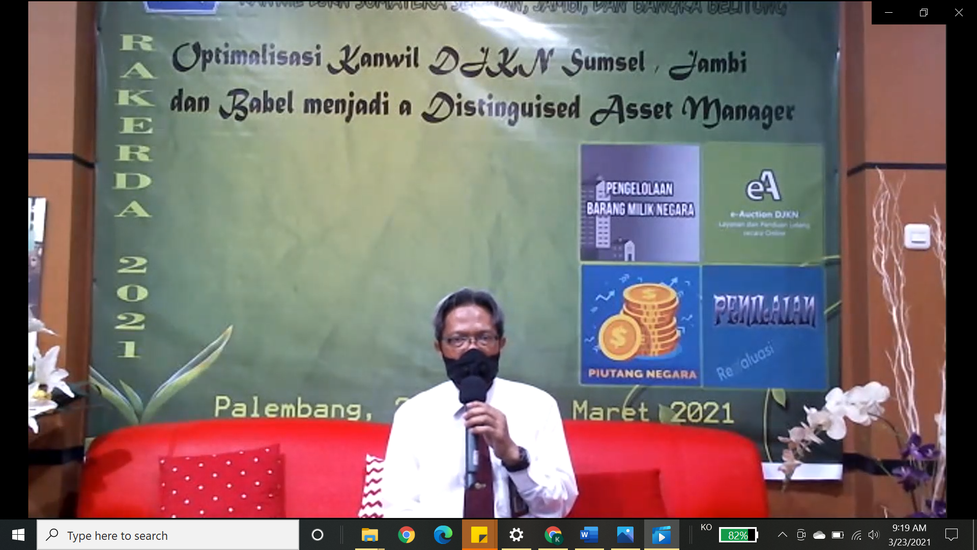 Palembang – Kantor Wilayah Direktorat Jenderal Kekayaan Negara Sumatera Selatan, Jambi, dan Bangka Belitung (Kanwil DJKN SJB) membuka penyelenggaraan Rapat Kerja Daerah (Rakerda) 2021 bertema “Optimalisasi Kanwil DJKN SJB menjadi Distinguished Asset Manager” pada Senin (22/3). Acara yang dijadwalkan berlangsung selama lima hari hingga Jumat (26/3) ini dihadiri oleh Direktur Jenderal Kekayaan Negara Rionald Silaban. Dalam arahannya, Rionald mengingatkan segenap jajaran Kanwil DJKN SJB bahwa Rakerda bukan hanya sarana informasi kinerja, tetapi harus dapat dimanfaatkan sebagai kesempatan untuk bersama meluruskan pandangan dan merapatkan barisan dalam memberikan layanan kepada masyarakat.