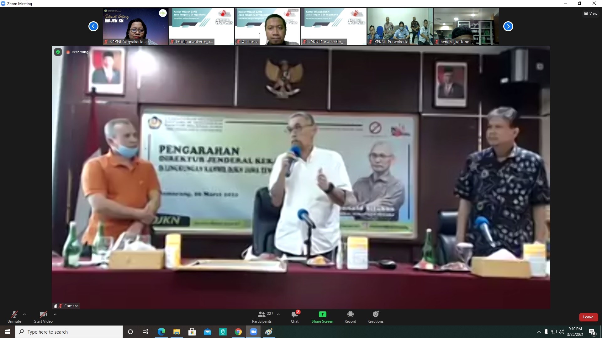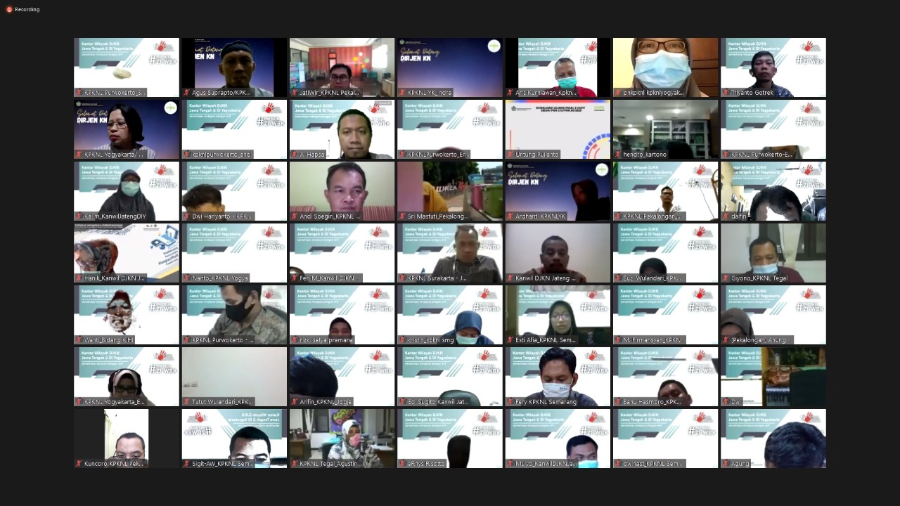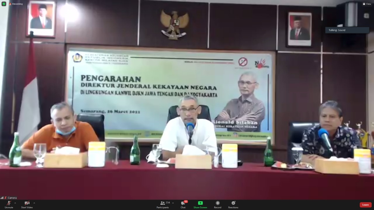Semarang – Direktur Jenderal Kekayaan Negara (Dirjen KN) Rionald Silaban memberikan arahan kepada para pegawai Kantor Wilayah Direktorat Jenderal Kekayaan Negara Jawa Tengah dan Daerah Istimewa Yogyakarta (Kanwil DJKN Jateng D.I.Y.) di tengah kesibukan mendampingi Wakil Menteri Keuangan dan Komisi XI DPR RI dalam rangka kunjungan kerja ke Kabupaten Demak, Kamis (25/3). Bersama Direktur Kekayaan Negara Dipisahkan Meirijal Nur, Rionald menyapa Pejabat Administrator Kanwil DJKN Jateng D.I.Y. dan KPKNL Semarang secara tatap muka, serta secara virtual kepada seluruh pegawai Kanwil Jateng D.I.Y.