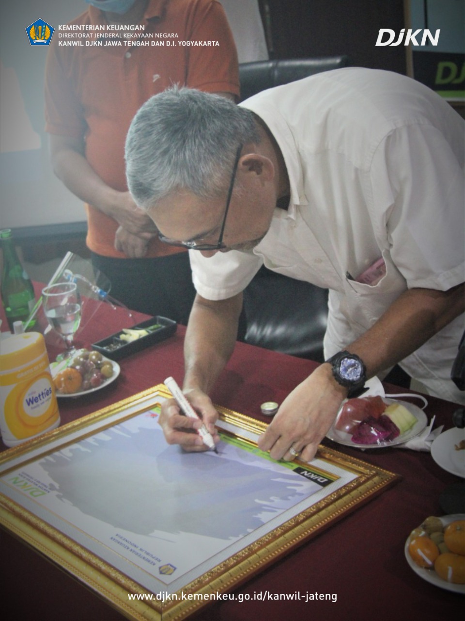 Kepala Kanwil DJKN Jateng D.I.Y. Mahmudsyah mengucapkan selamat datang dan terima kasih kepada Dirjen KN yang telah menyempatkan diri di tengah padatnya acara dan keterbatasan waktu. Dalam kesempatan ini, Mahmudsyah memaparkan pelaksanaan tugas di Kanwil DJKN Jateng D.I.Y. yang mencakup Nilai Kinerja Organisasi, Indikator Kinerja Utama (IKU) menantang di tahun 2021, serta berbagai inovasi yang telah diterbitkan dan digunakan, berikut penghargaan yang telah diraih oleh KPKNL di lingkungan Kanwil DJKN Jateng D.I.Y.