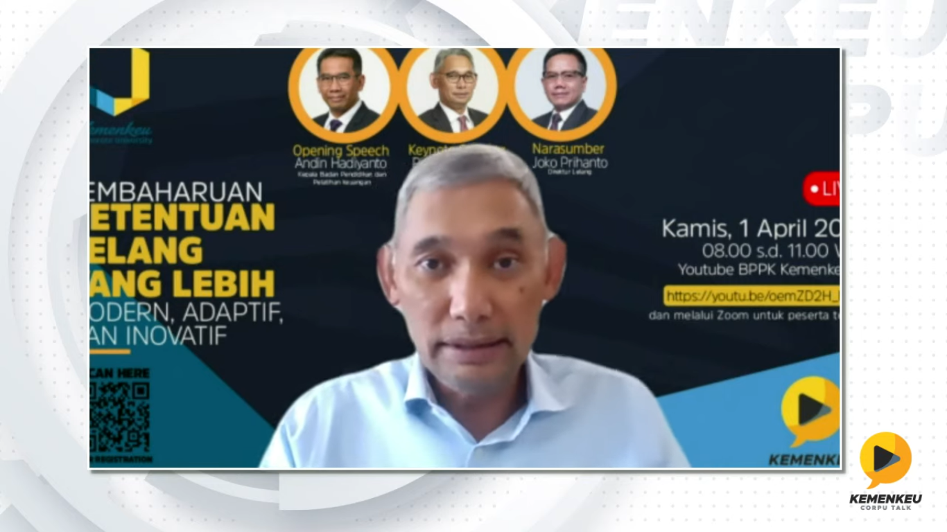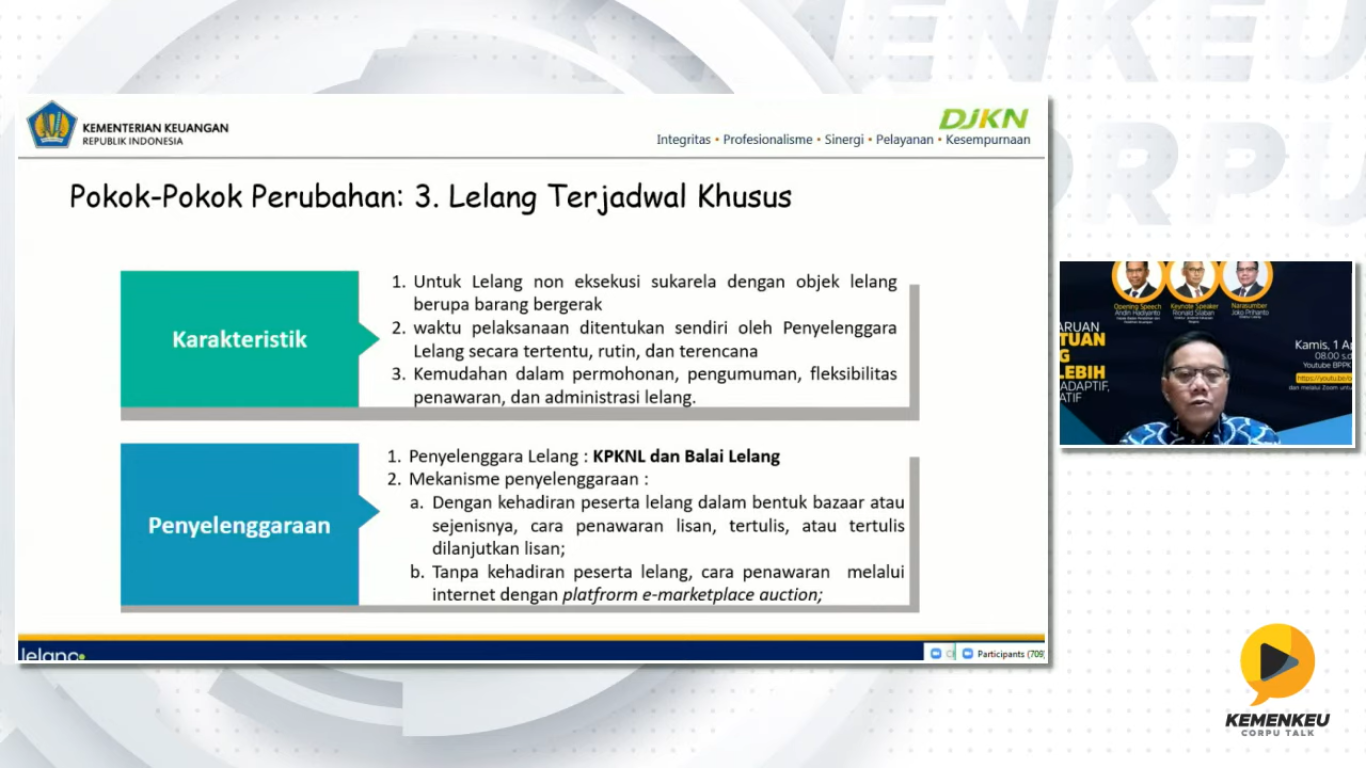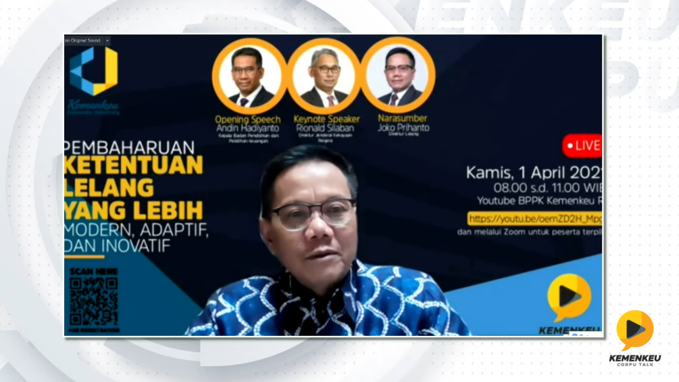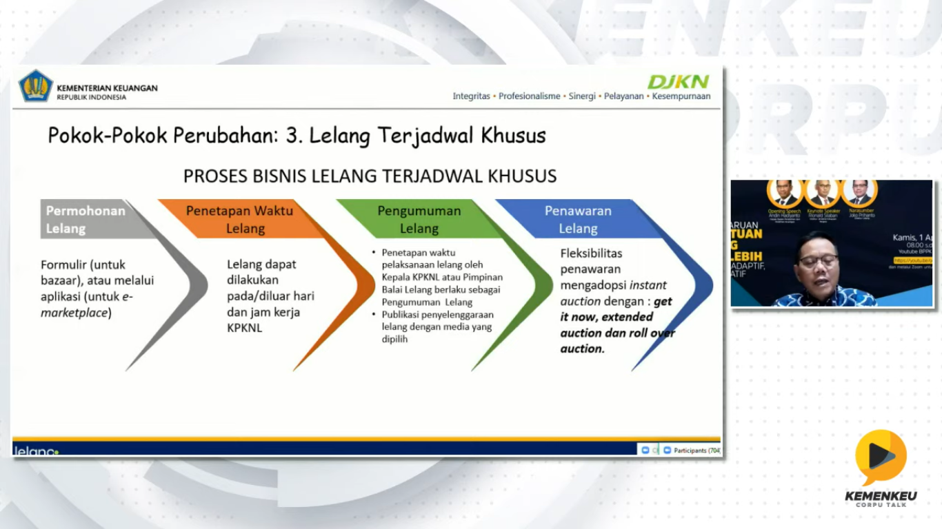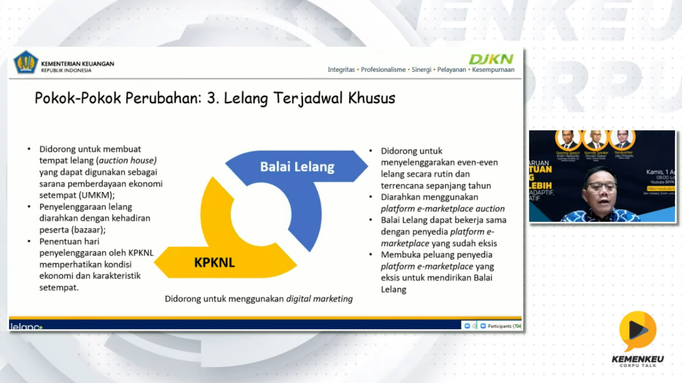 Jakarta – Direktorat Jenderal Kekayaan Negara (DJKN) senantiasa berkomitmen untuk meningkatkan pelayanan melalui penguatan-penguatan kebijakan, salah satunya dalam bentuk penyempurnaan ketentuan lelang yang lebih modern, adaptif, dan inovatif pada Peraturan Menteri Keuangan (PMK) Nomor 213/PMK.06/2020 tentang Petunjuk Pelaksanaan Lelang. Hal ini disampaikan oleh Direktur Jenderal Kekayaan Negara Rionald Silaban ketika memberi kata sambutan pada webinar Kemenkeu Corpu Talk, Kamis (3/4).