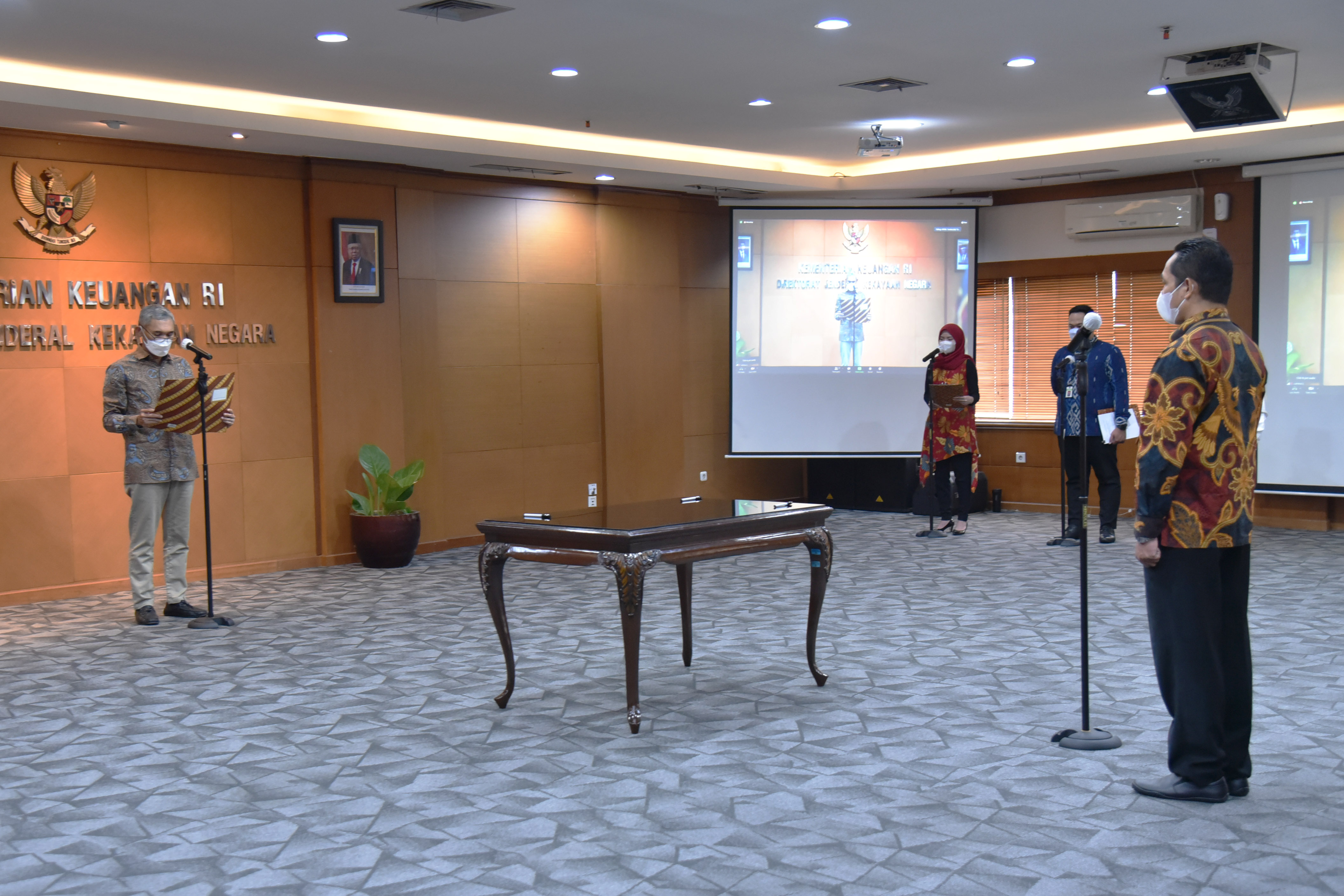 Pelantikan dan pengambilan sumpah pejabat ini dilakukan secara fisik di Kantor Pusat DJKN sekaligus virtual melalui telekonferensi bagi para pejabat fungsional yang berada di luar Jakarta. Turut hadir sebagai saksi dalam acara ini, Sekretaris DJKN Dedy Syarif Usman dan Direktur Lelang Joko Prihanto. (ff/lia)