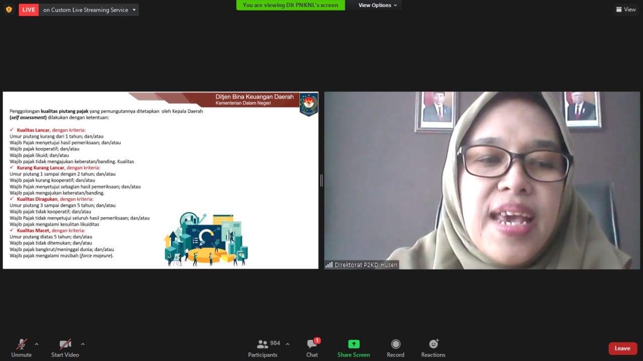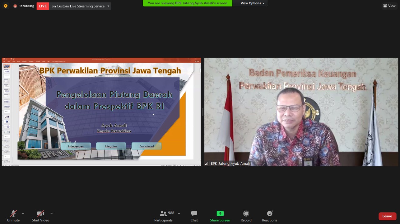 Pada webinar tersebut, hadir juga sebagai narasumber dari Direktorat Jenderal Bina Keuangan Daerah Kementerian Dalam Negeri Muliani S. Fajarianti dan dari Badan Pengawas Keuangan Republik Indonesia (BPK RI) Perwakilan Provinsi Jateng Ayub Amali. Muliani menjelaskan Kebijakan Pengelolaan Piutang Daerah berdasarkan Permendagri No.77/2020 sementara Ayub menjelaskan Pengelolaan Piutang Daerah dalam prespektif BPK RI. (fz/ek-Humas)