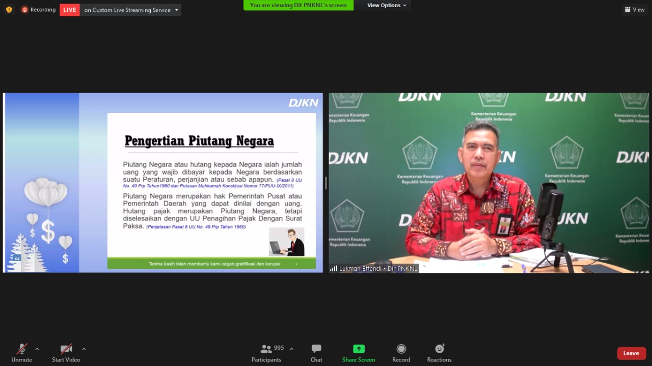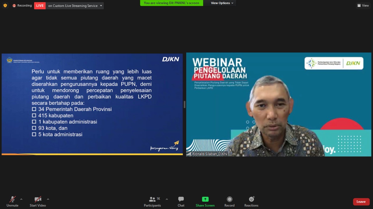 Jakarta – Direktorat Jenderal Kekayaan Negara (DJKN) terus mendorong percepatan penyelesaian piutang daerah serta perbaikan kualitas Laporan Keuangan Pemerintah Daerah (LKPD). “Kita perlu memiliki strategi penyelesaian piutang daerah macet secara komprehensif demi perbaikan kualitas LKPD,” ungkap Direktur Jenderal Kekayaan Negara Rionald Silaban dalam Kegiatan Webinar Pengelolaan Piutang Daerah pada Kamis (27/06) secara daring.