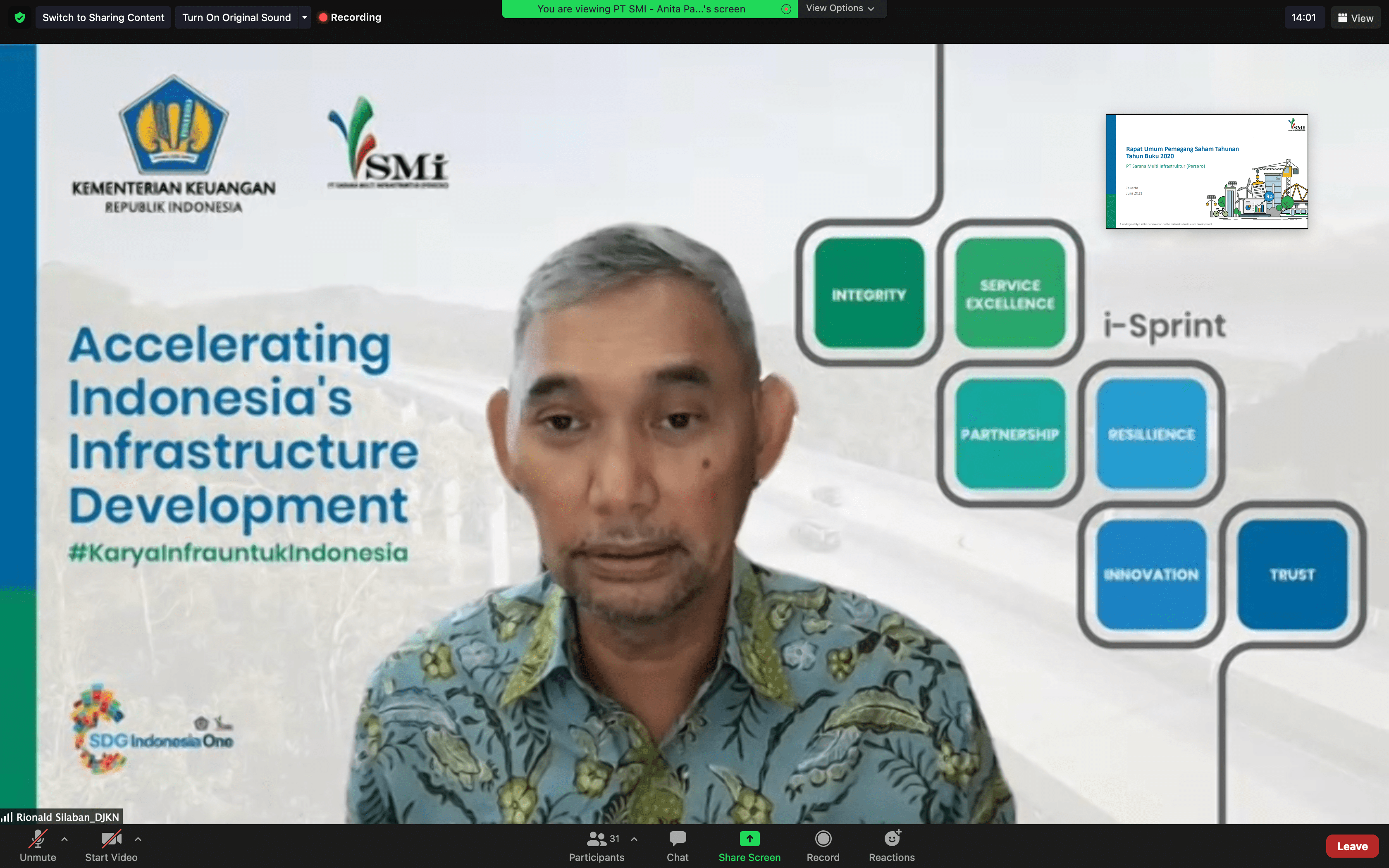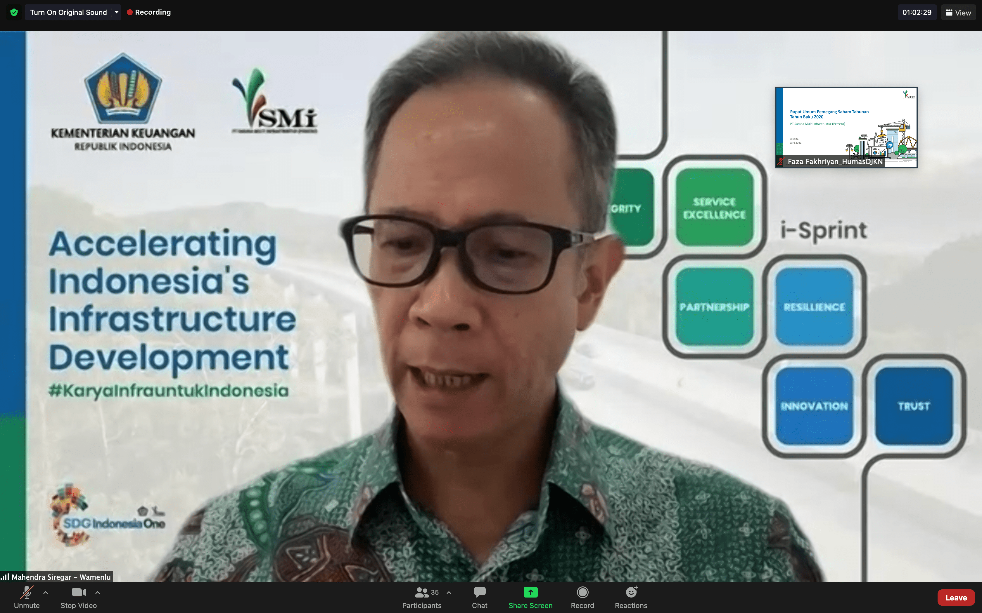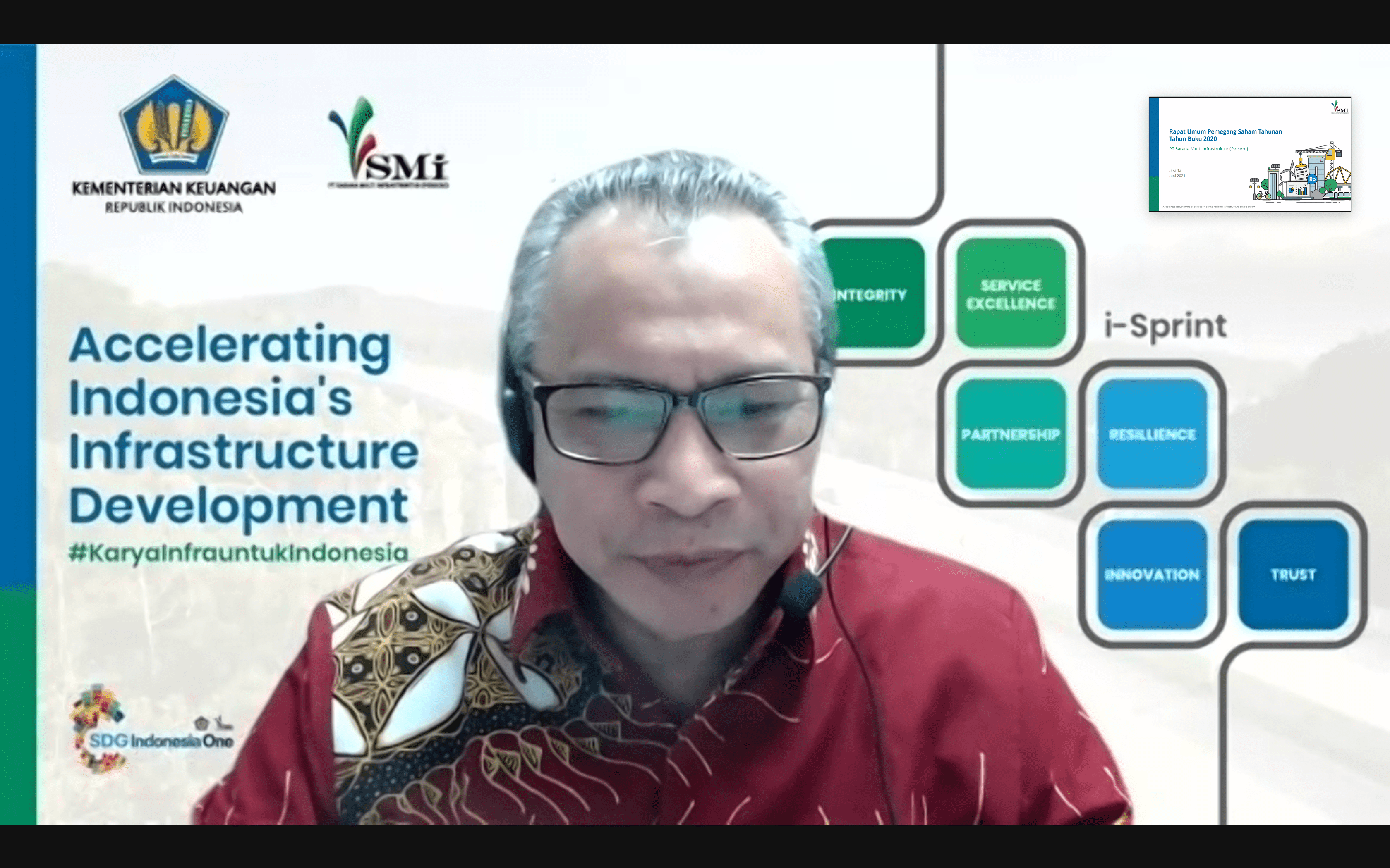 Jakarta – PT Sarana Multi Infrastruktur (PT SMI) berhasil melampaui target Rencana Kerja dan Anggaran Perusahaan (RKAP) Tahun Anggaran 2020. Dalam laporan keuangan 2020 (audited) dijelaskan bahwa PT SMI berhasil membukukan laba bersih sebesar Rp1,907 triliun setara dengan 108,7 persen dari RKAP 2020. “Secara umum, kualitas laba maupun hal-hal lain yang menunjukan kinerja perusahaan saya rasa sangat baik. Laba bersih bahkan meningkat dari Rp1,7 triliun menjadi Rp1,9 triliun ditengah pandemi,” jelas Direktur PT SMI Edwin Syahruzad dalam Rapat Umum Pemegang Saham Tahunan Tahun Buku 2020 PT SMI yang diadakan secara daring pada Selasa (22/06).