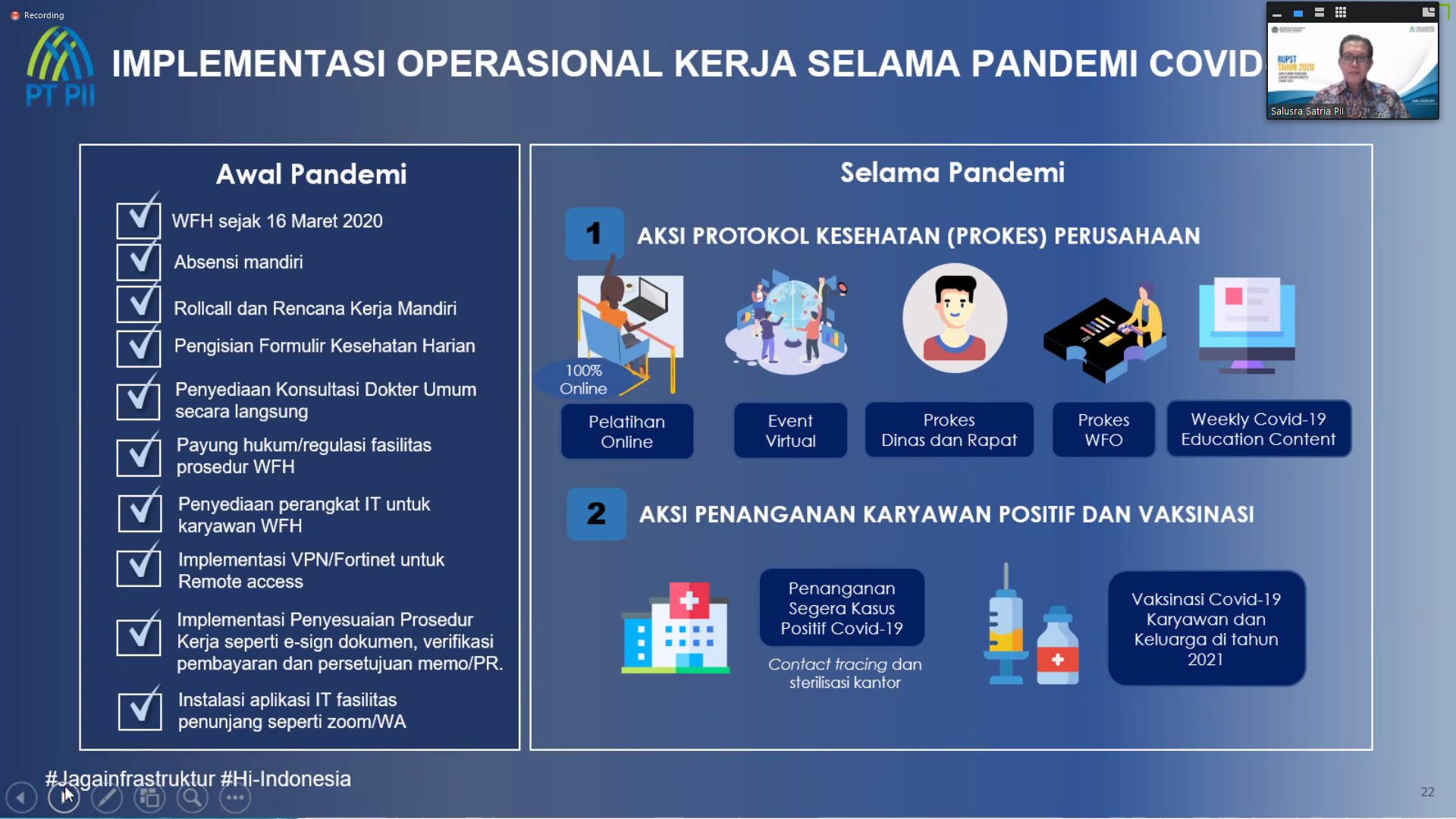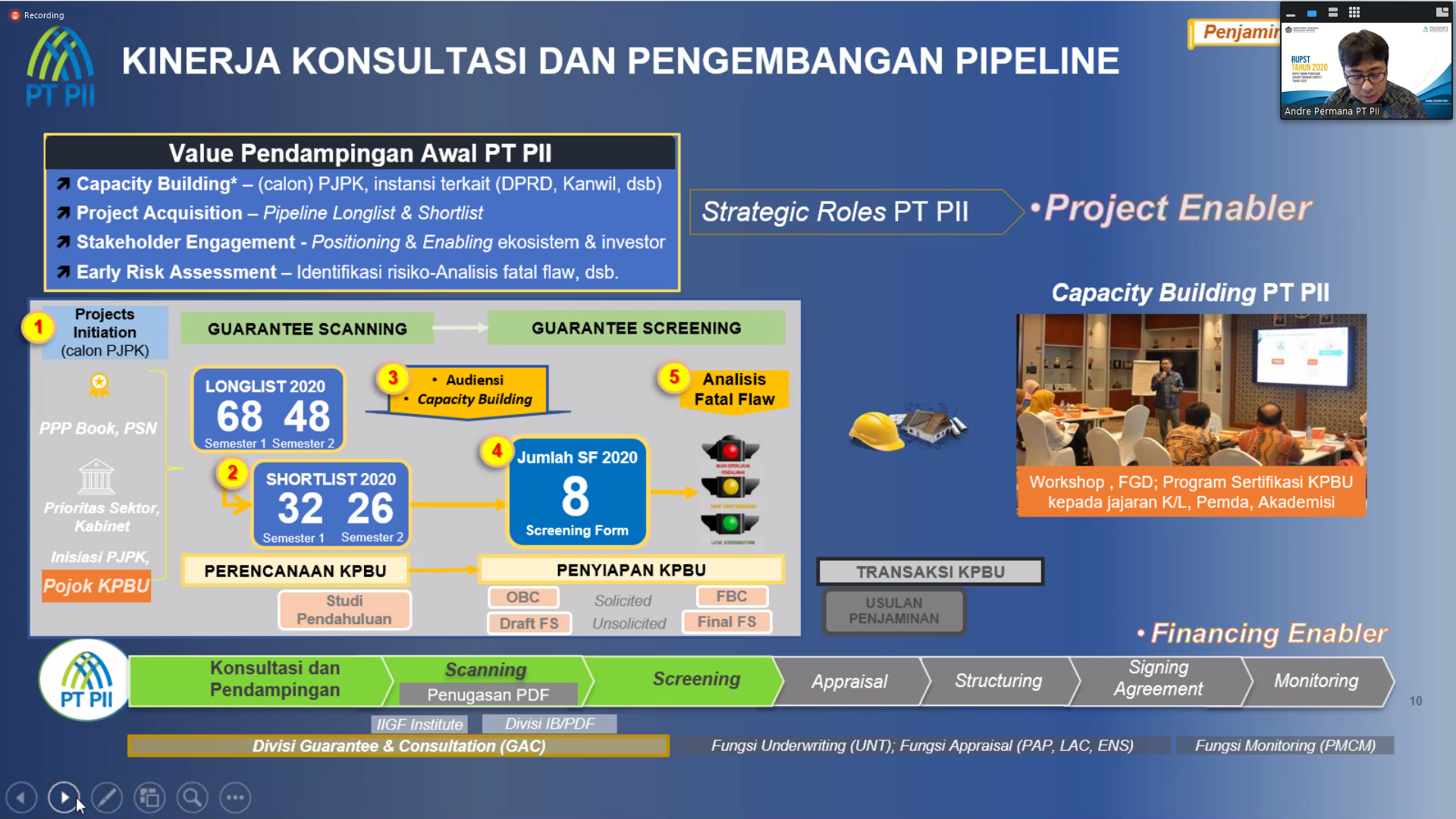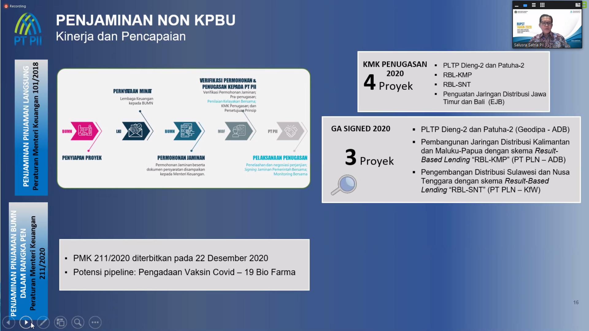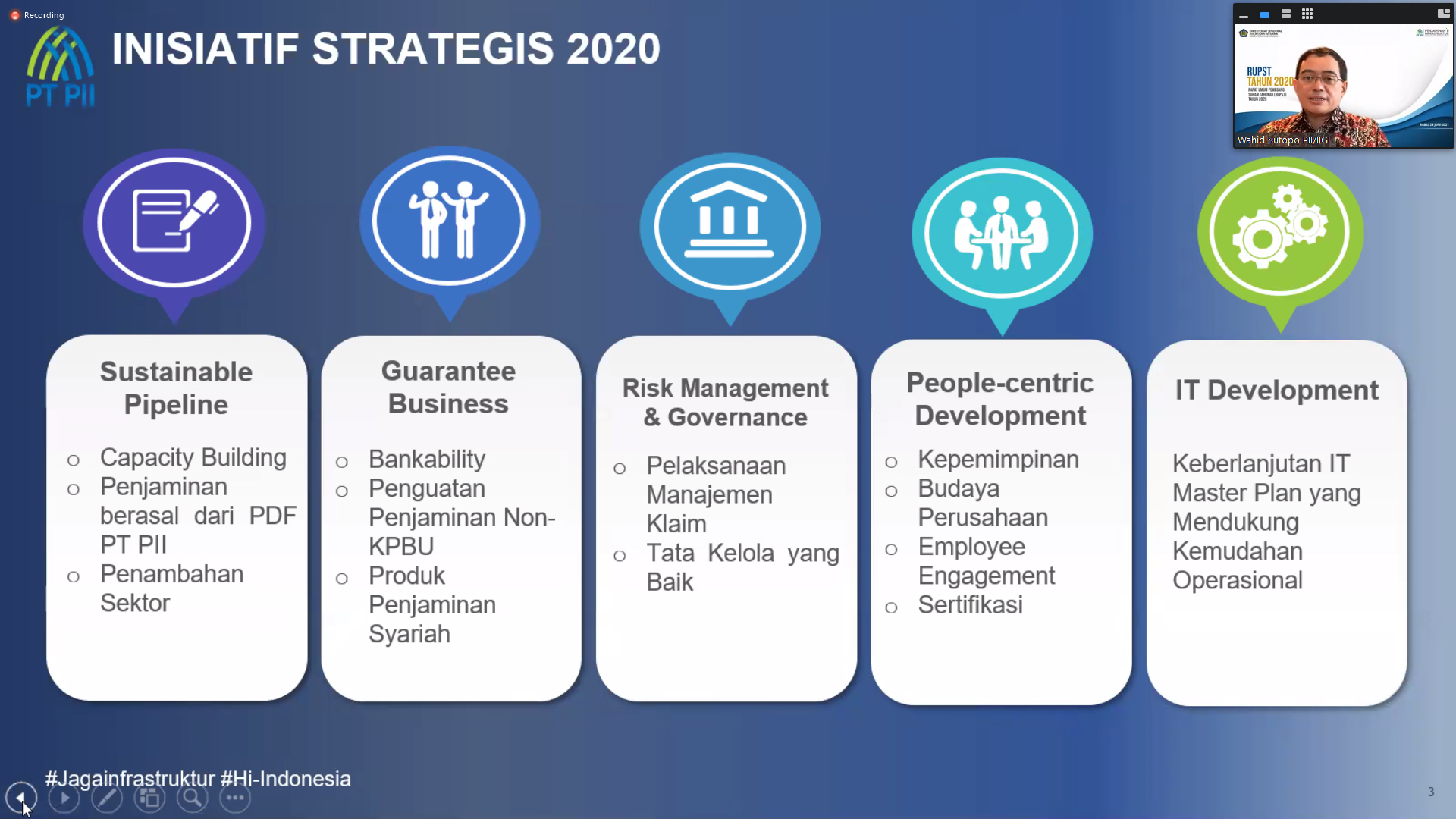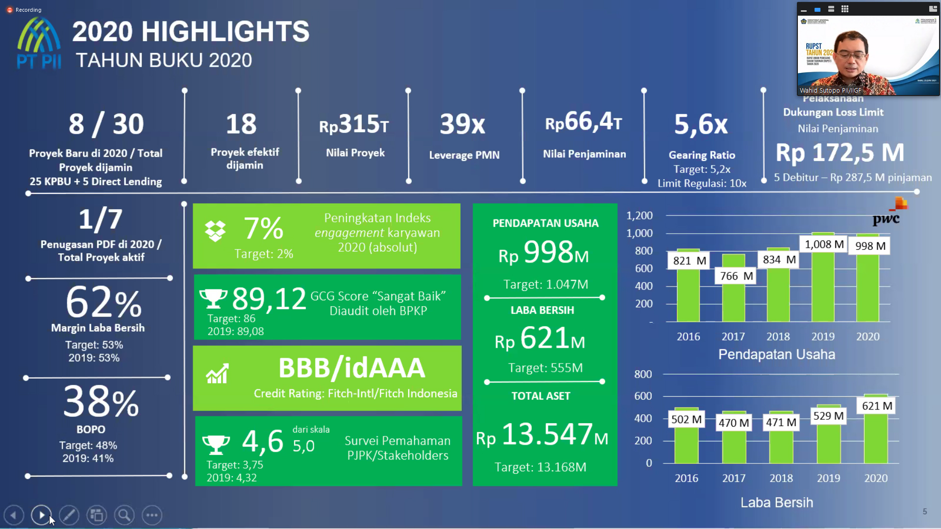 Dalam kesempatan pemaparan capaian kinerja perseroan, Direktur Utama PT PII Muhammad Wahid Suto menyampaikan bahwa pandemi Covid-19 merupakan salah satu tantangan terbesar yang dihadapi oleh perseroan pada tahun 2020. Meskipun demikian, ia menegaskan bahwa hal tersebut tak menjadi halangan perseroan mencapai kinerja yang baik. Hal tersebut tergambar pada capaian kinerja operasional PT PII yang berhasil melaksanakan penjaminan pada 30 proyek sampai dengan akhir tahun 2020 dengan nilai total proyek yang sudah berjalan sebesar Rp315 triliun. "Dari 30 proyek penjaminan yang telah diberikan, terdiri dari 25 proyek KPBU (Kerjasama Pemerintah dengan Badan Usaha-red) dan 5 proyek direct lending", imbuhnya.
