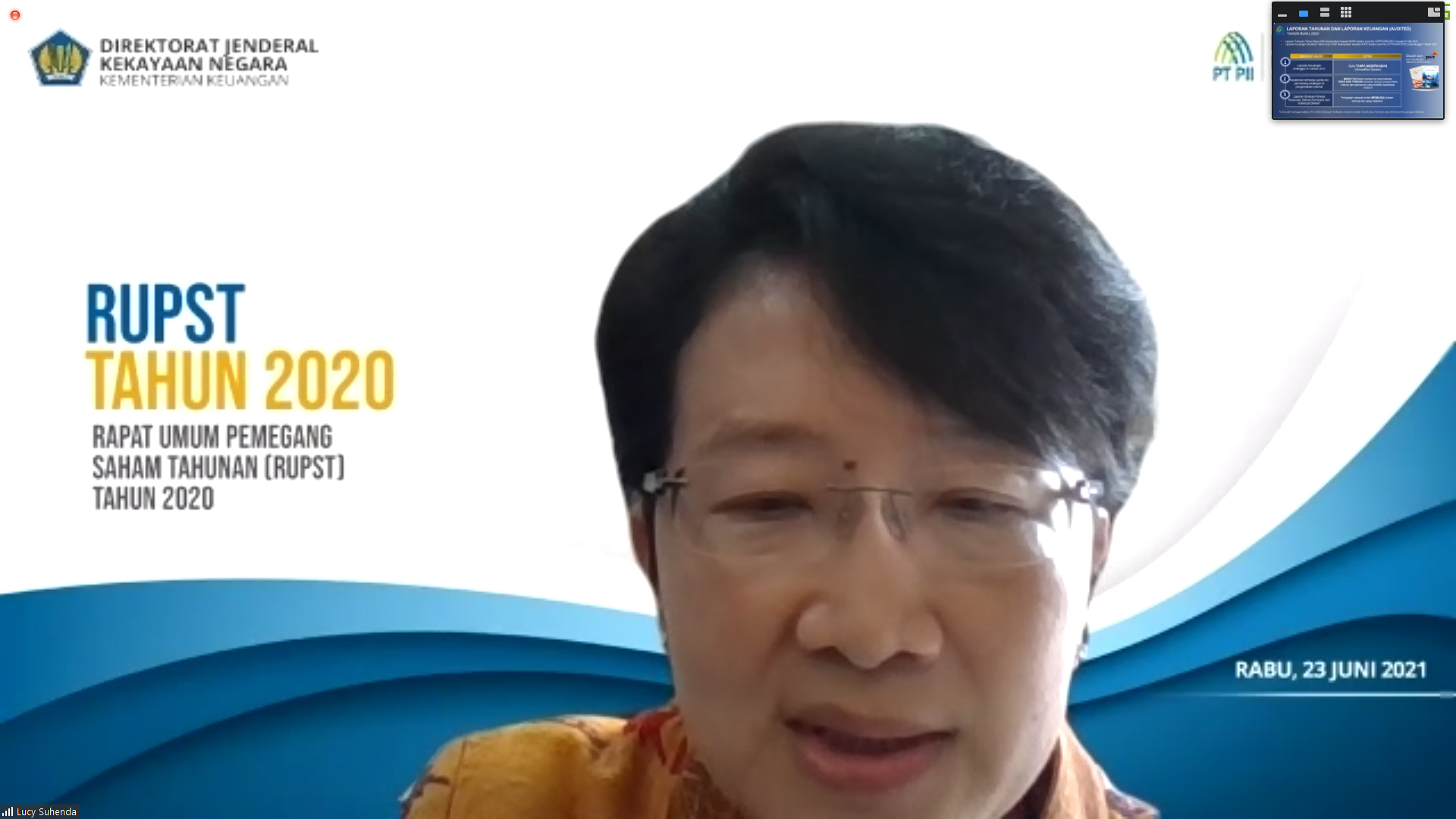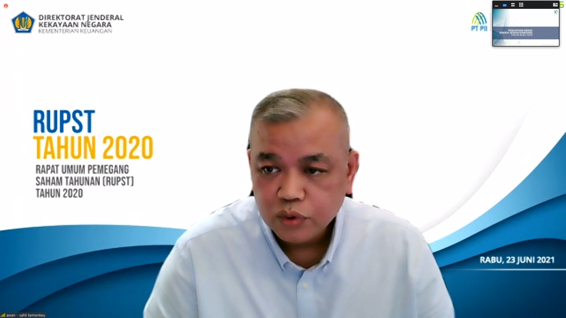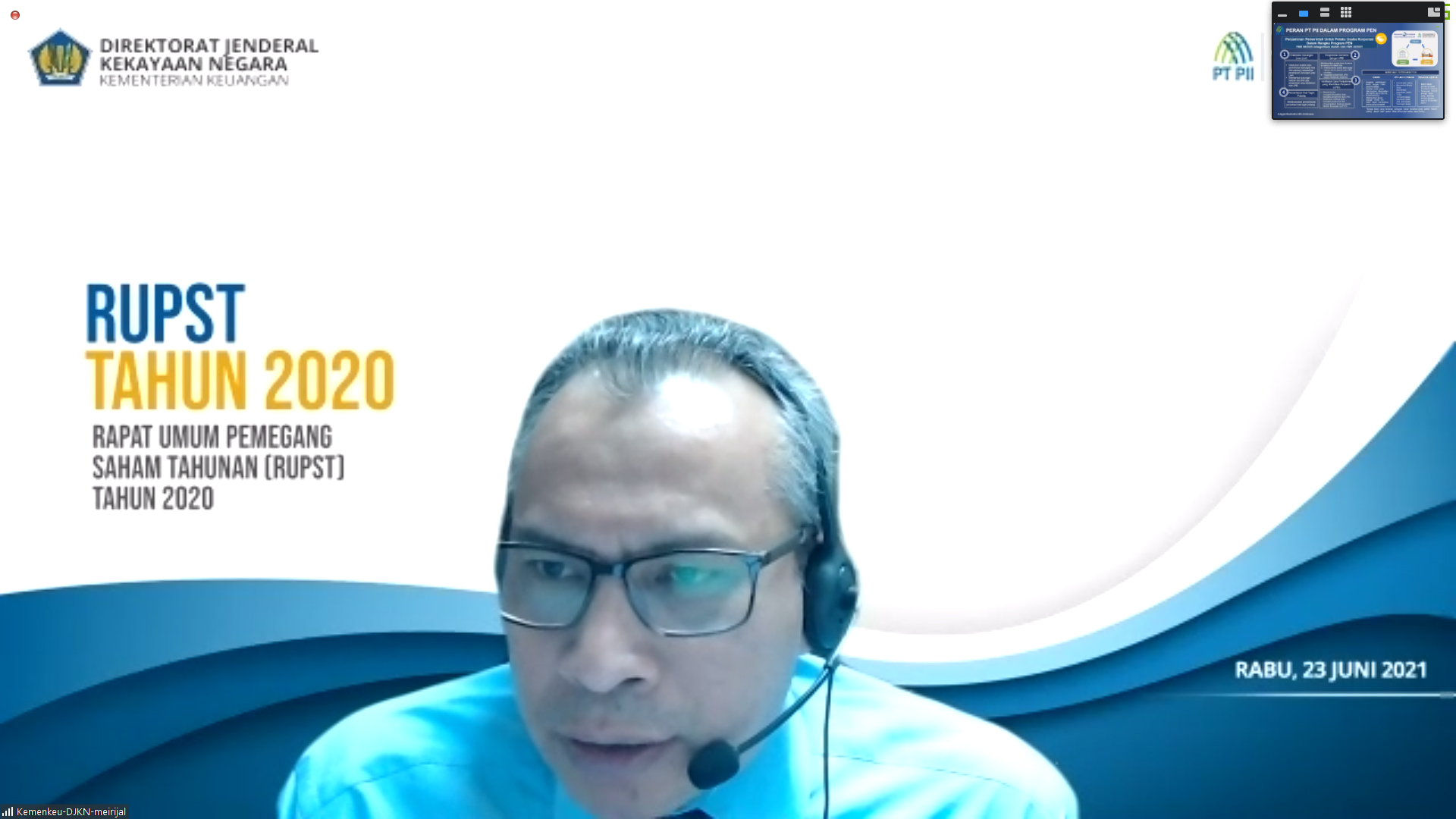 Jakarta – Rapat Umum Pemegang Saham (RUPS) Tahun Buku 2020 PT Penjaminan Infrastruktur Indonesia (Persero) "PT PII" telah selesai digelar secara dari pada Rabu (23/6). Rapat yang dipimpin oleh Direktur Jenderal Kekayaan Negara atas nama Menteri Keuangan selaku kuasa pemegang saham perseroan dihadiri oleh Dewan Komisaris PT PII, Direksi PT PII, dan tamu undangan. Agenda pembahasan rapat mencakup persetujuan atas laporan tahunan perseroan serta penetapan keputusan penggunaan laba bersih perseroan tahun 2020.