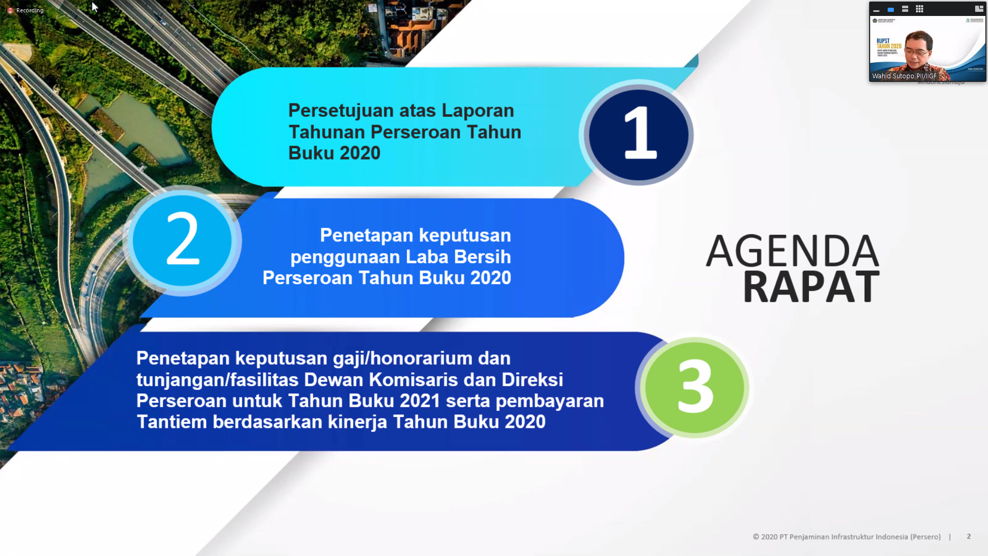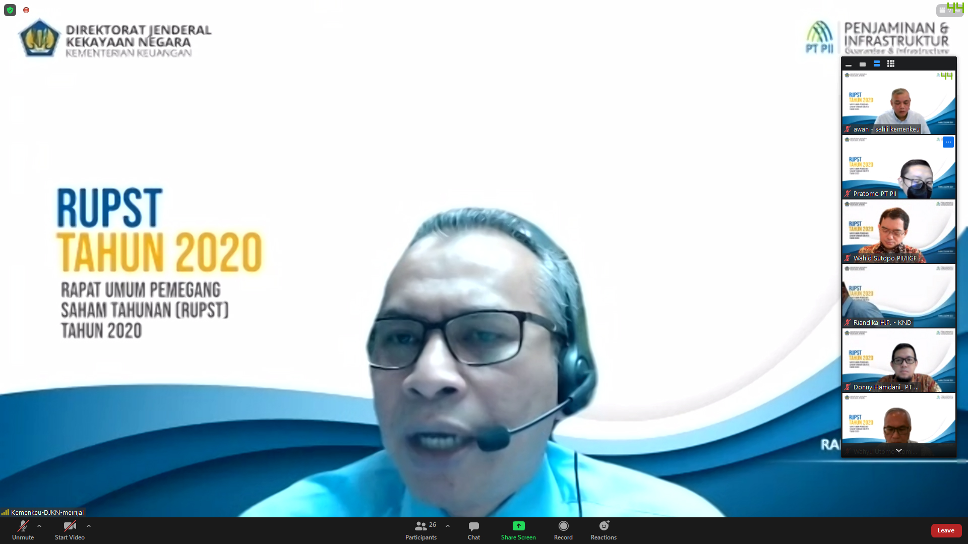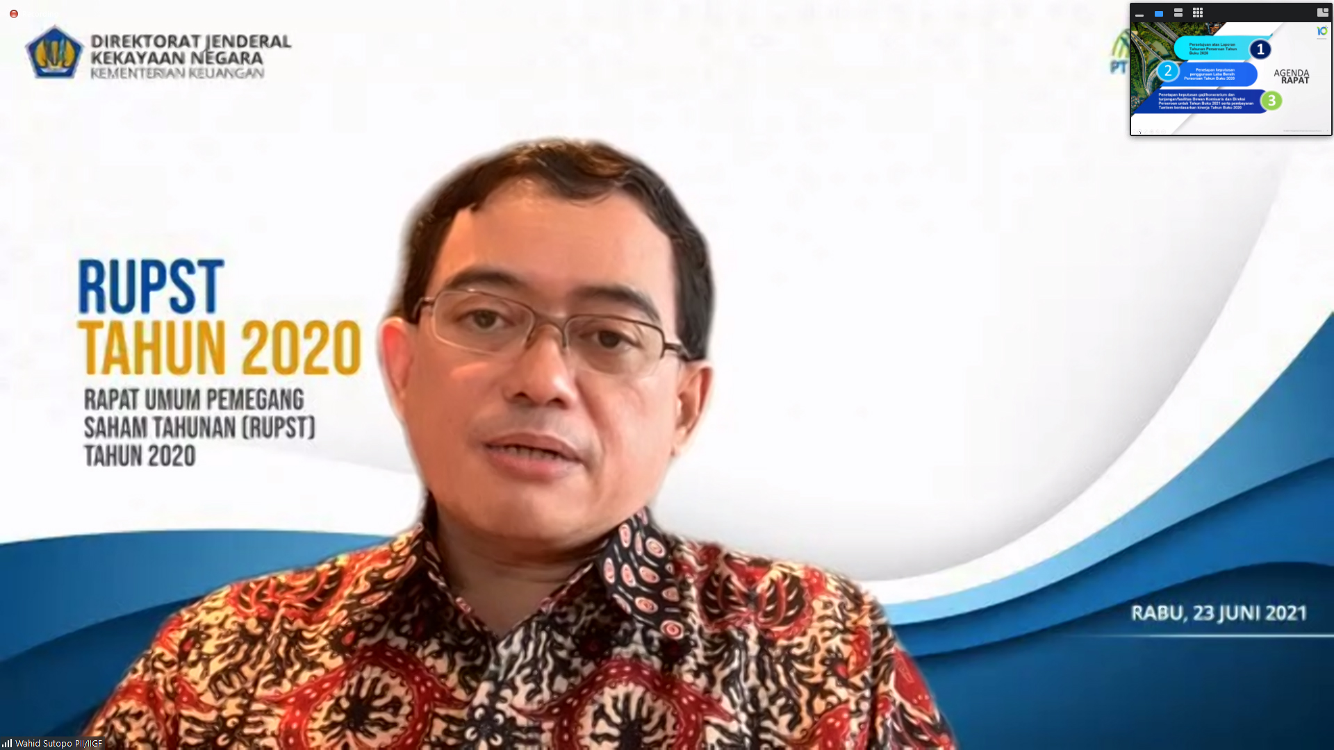 Jakarta – Rapat Umum Pemegang Saham (RUPS) Tahun Buku 2020 PT Penjaminan Infrastruktur Indonesia (Persero) "PT PII" telah selesai digelar secara dari pada Rabu (23/6). Rapat yang dipimpin oleh Direktur Jenderal Kekayaan Negara atas nama Menteri Keuangan selaku kuasa pemegang saham perseroan dihadiri oleh Dewan Komisaris PT PII, Direksi PT PII, dan tamu undangan. Agenda pembahasan rapat mencakup persetujuan atas laporan tahunan perseroan serta penetapan keputusan penggunaan laba bersih perseroan tahun 2020.