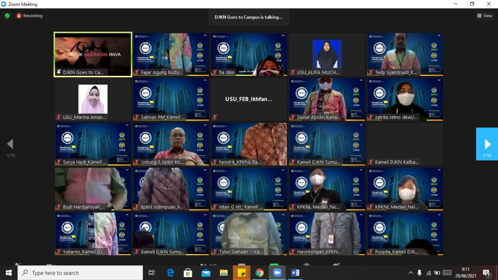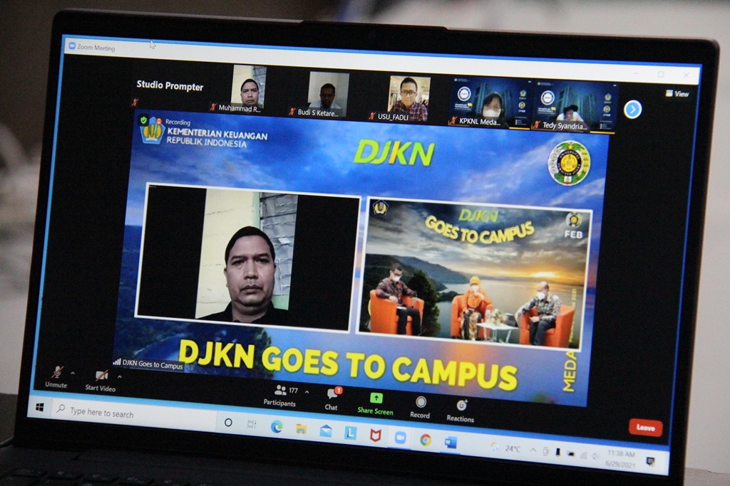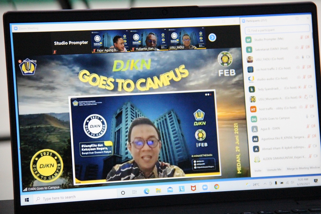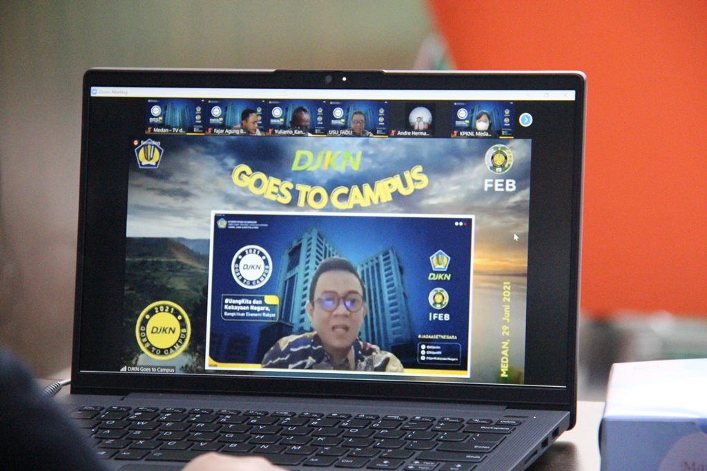 Medan – Kantor Wilayah (Kanwil) Direktorat Jenderal Kekayaan Negara (DJKN) Sumatera Utara dan Kantor Pelayanan Kekayaan Negara dan Lelang (KPKNL) Medan bekerjasama dengan Balai Diklat Keuangan (BDK) Medan dalam penyelenggaraaan DJKN Goes To Campus (GTC) ke Universitas Sumatera Utara (USU) yang mengusung tema "#UangKita dan Kekayaan Negara, Bangkitkan Ekonomi Rakyat" pada Selasa, 29 Juni 2021. Dalam kegiatan tersebut, Kepala Kanwil DJKN Sumatera Utara Tedy Syandriadi mengajak seluruh mahasiswa untuk dapat bersama-sama bersinergi dalam mendukung program Pemulihan Ekonomi Nasional (PEN). “Mari dukung Pemerintah dengan tetap menjaga optimisme, mengawal implementasi APBN dan memperkuat sinergi kebijakan ekonomi dalam mendukung percepatan program Pemulihan Eknomomi Nasional,” ujarnya.