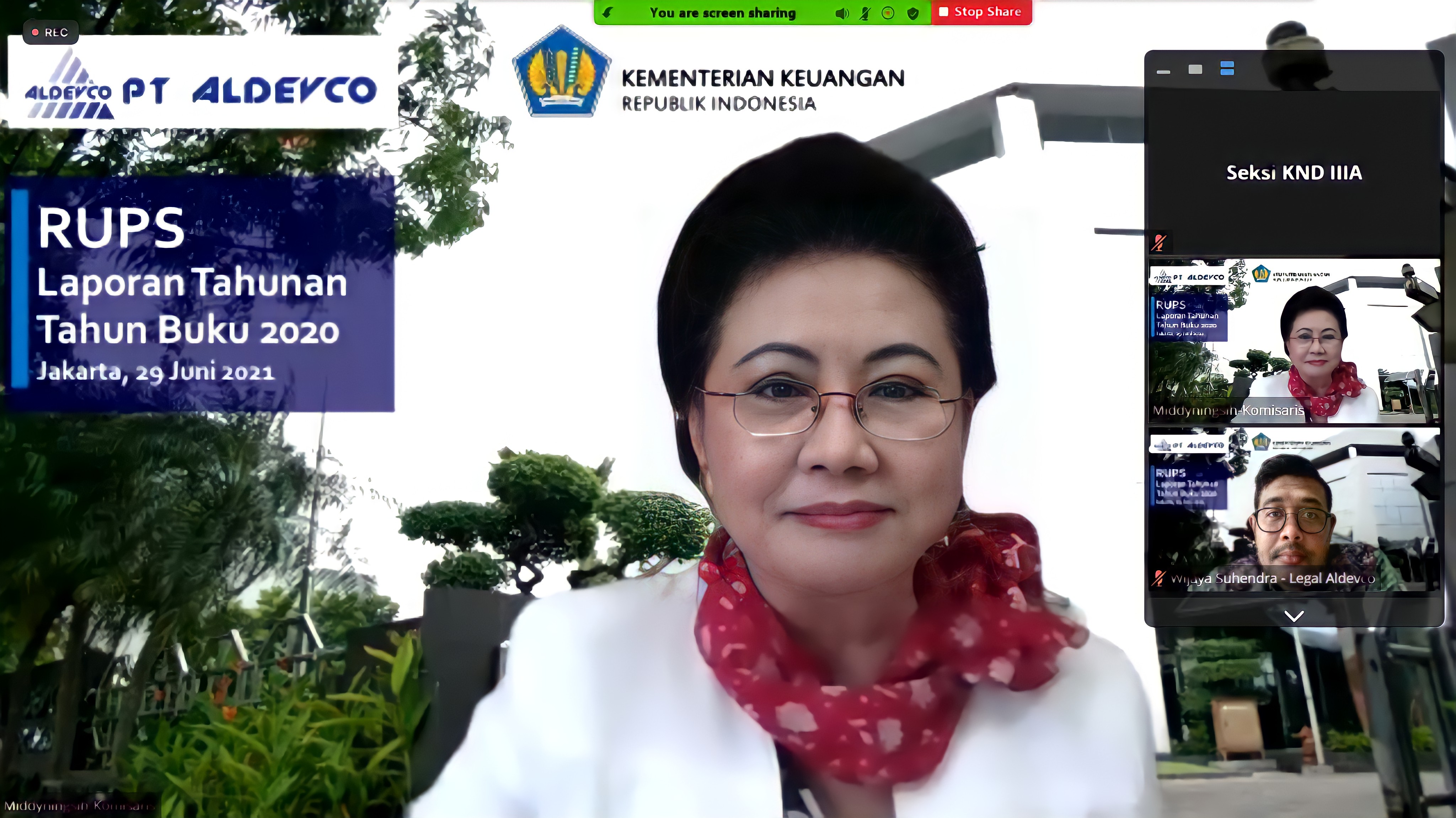 Selanjutnya, Middyningsih selaku Komisaris PT Aldevco melaporkan evaluasi dan pendapatnya atas laporan pertanggungjawaban direksi untuk tahun buku 2020. Middy mengapresiasi kinerja Direksi PT Aldevco bahwa di tengah merebaknya wabah virus Covid-19 dan persaingan antarperusahaan penyedia ruangan kantor yang meningkat di wilayah Jakarta Selatan, PT Aldevco justru berhasil memperbesar tingkat okupansi gedung, dari angka 72% di tahun 2019 menjadi 88% di tahun 2020. Middy menambahkan, “Tahun 2020 dapat dikatan sebagai tahun konsolidasi bagi Aldevco dengan telah dicapaikan berbagai milestone yang sangat berarti, seperti pelunasan pitang perseroan yang bertahun-tahun menajdi ganjalan serta tuntasnya proses penjualasn aset PT AAA, dimana Aldevco adalah pemegang 50,09% sahamnya”.
